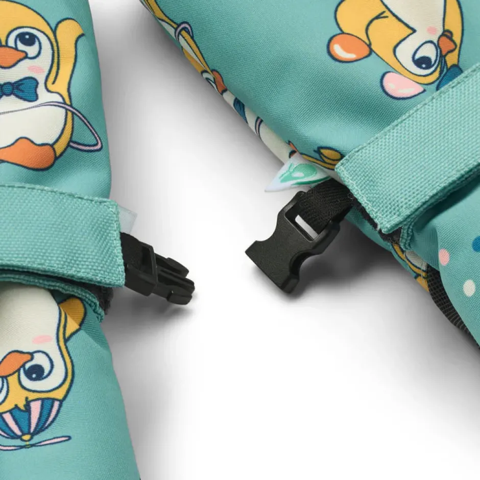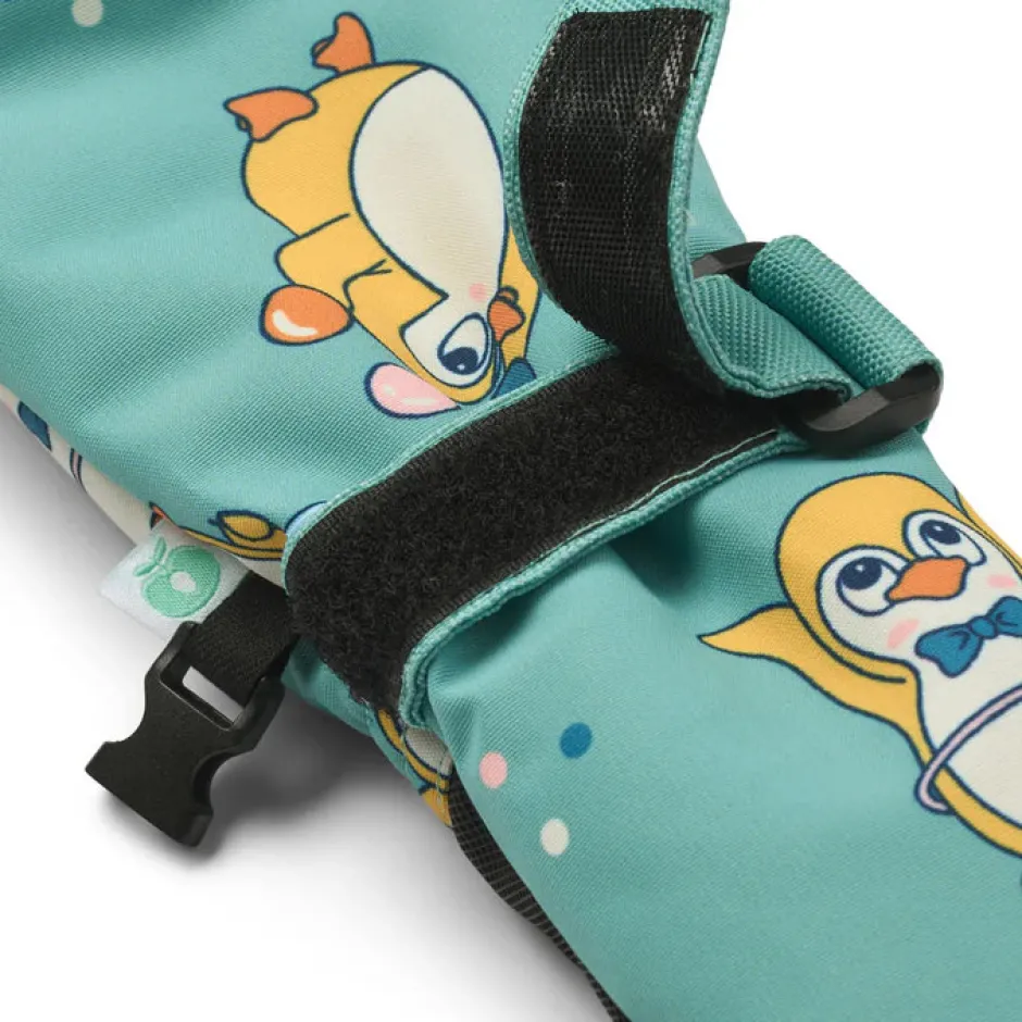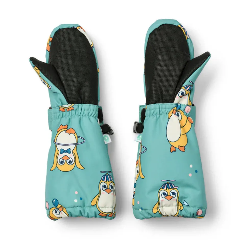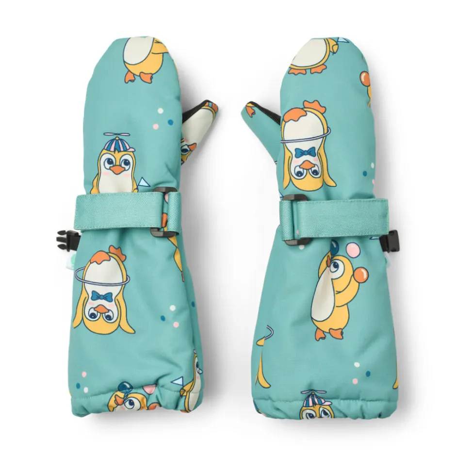 Luffer med pingviner. Disse luffer har en justerbar velcrostrop ved håndledet og kan klipses sammen med et spænde. Handskerne har slidstærk belægning i i håndfladen og et længere skaftestykke ved håndleddene, der forhindre kold vind og sne fra at trænge ind.