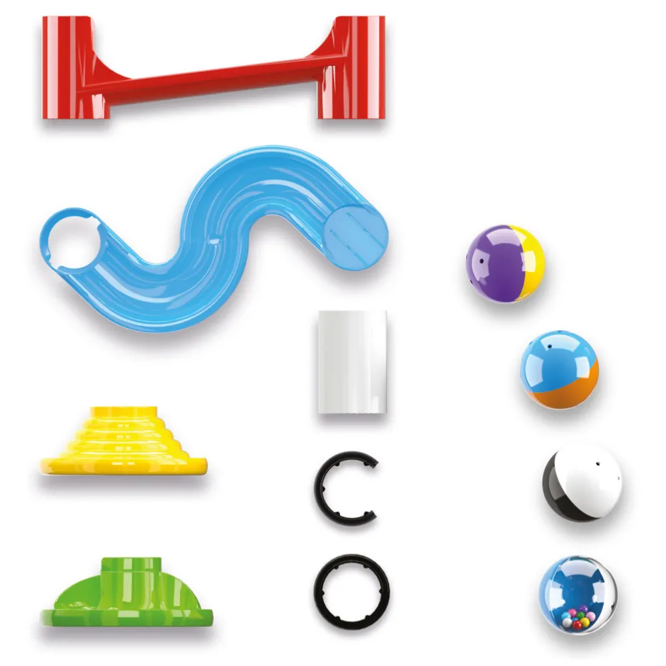 Dette flotte legetøj træner dit barns finmotorik ved at bygge banen, gribe om og slippe kuglerne samt forståelsen af årsag og virkning ved at se kuglerne trille ned ad den sjove bane.
