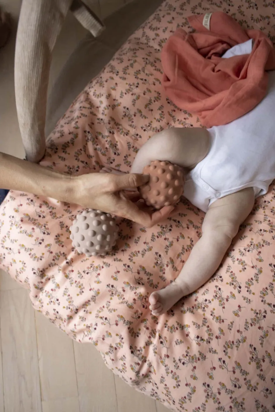 Pil sense ball er designet med henblik på motorisk udvikling. Med hjertet i Fillibabba´s produkter har de skabt en bold-kollektion med taktile overflader, gode egenskaber og i fine farvenuancer. Pil sense ball er produceret i 100% naturgummi og er med til at stimulere barnets motorik og gribereflekser. Med en fin mild klokkelyd indeni stimulerer den også barnets høresans. På overfladen er der produceret små buler, som er ideelle til børn med sanselige behov, eller børn som bare trænger til lidt blid berøring, samtidig er alle kanter bløde, så de kan hjælpe på ømme gummer og er stimulerende for den taktile sans. Fantastisk produkt til at udvikle barnets finmotorik.