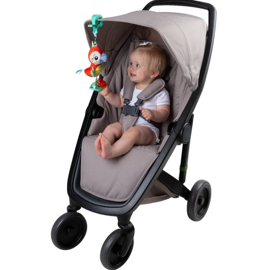 Det søde fugl er let at fastgøre til f.eks. Klapvognen, så du har lidt underholdning med. I benene er der fine små kugler der rasler sjovt og som barnet kan få øje på.