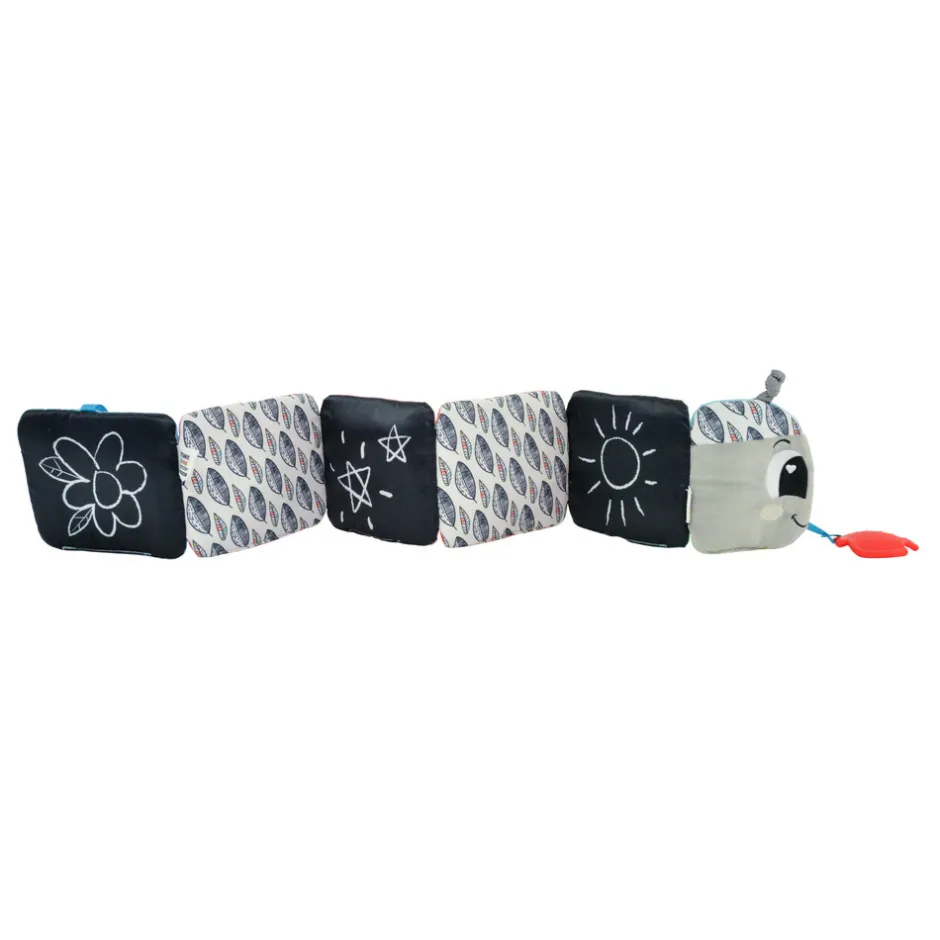 Den fine fold ud bog fra Lamaze har flotte, enkle og grafiske sort/hvide tegninger på den ene side. De sort/hvide kontraster er det første baby kan se. Fra barnet er et par måneder udvikles farvesynet langsomt. Så på den anden side af bogen er der søde tegninger i farver. Bogen kan f.eks. sættes i liften, kravlegården eller vuggen.