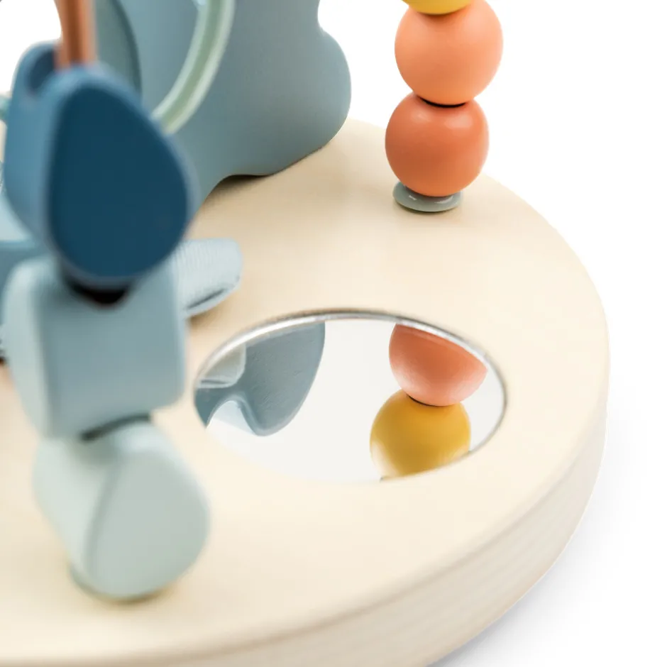Med Wally kuglelabyrint kan dit barn flytte de små kugler og fisk fra den ene ende til den anden, og træne finmotorik og pincetgreb gennem leg. Wally og de andre hav-elementer inspirerer dit barn til at være nysgerrig på livet under vandet. De små fingre kan bevæge fisken op, ned og rundt for at udforske den i det lille spejl og barnet kan lade den svømme igennem maven på Wally. Hvalens finner er lavet i blødt, holdbart, knitrende tekstil, og bunden er designet til at stå stabilt på gulvet. Wally trækuglebanen er designet i blå nuancer med farverige detaljer. Den er fremstillet af ansvarligt produceret træ og malet med vandbaseret maling, der er fri for skadelige stoffer – hvilket gør den sikker for dit barn at bruge.