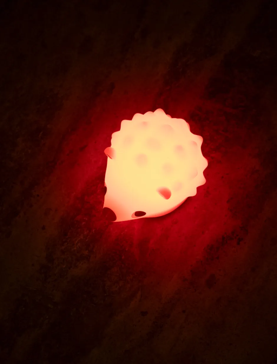 Det trofaste pindsvin Henning passer på dig hele natten, for mens du putter, lyser han dit børneværelse op og skaber den hyggeligste stemning. Filibabbas lille lysende LED-pindsvinelampe giver dig tryghed og lyser blidt ved din pusleplads, når du bliver skiftet eller på dine forældres sengeborde, når du spiser om natten. Giv Henning et kærligt puf og se ham lyse i mørket. Pindsvinet Henning er den perfekte natlampe, da det røde lys fremmer produktionen af søvnhormonet melatonin og hjælper dit lille barn med at falde i søvn*. Den fine pindsvin er fremstillet i blød, cremefarvet silikone og har genopladelige batterier, som lades op ved hjælp af et USB-stik. Efter blot to timers opladning lyser vågelampen i 12-15 timer. Selvom lampen lyser i lang tid, bliver dens LED-lyskilde ikke varm.