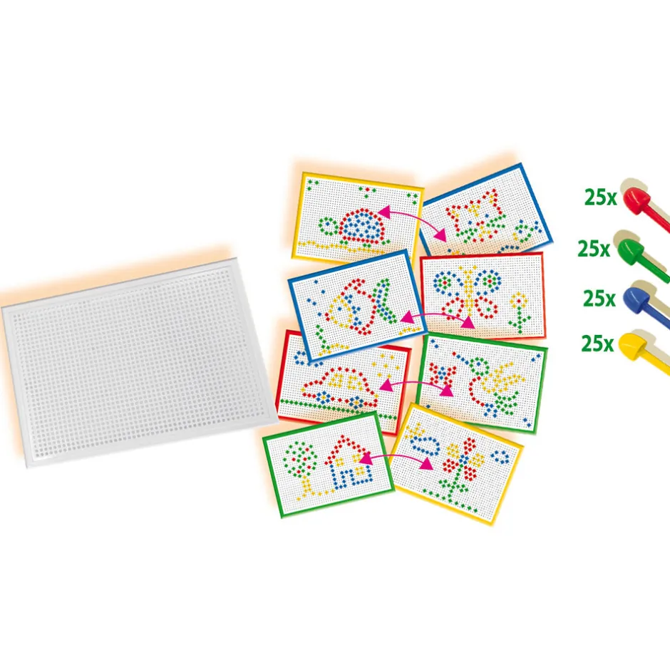 Med denne mosaikplade kan du lave de smukkeste figurer. Bare sætte de farvede stifter (grøn, gul, rød, blå) ned i pladen. Brug din fantasi til at skabe lige, hvad du ønsker, eller følg de medfølgende eksempler. Du kan genbruge denne plade igen og igen. Hvid mosaik plade. 100 farvede søm. 4 eksempler. Mosaikplade af god kvalitet. Stimulerer kreativitet og fantasi. Indeholder gode eksempler til at kopiere.