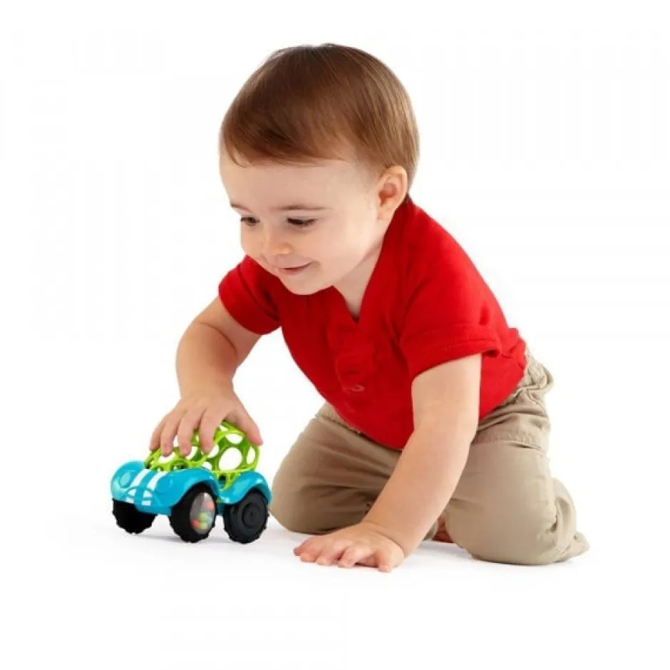 Oball Rattle & Roll bilerne findes i 2 forskellige farver – inde i hjulene ligger der små perler i forskellige farver som rasler når hjuleje drejer