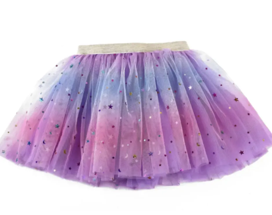Et magisk tylskørt i lilla, rosa og blå nuancer, pyntet med små glitrende stjerner. Det svæver let om barnet og forvandler ethvert øjeblik til et eventyr af dans og drømme. Perfekt til leg, fest og magiske hverdage.