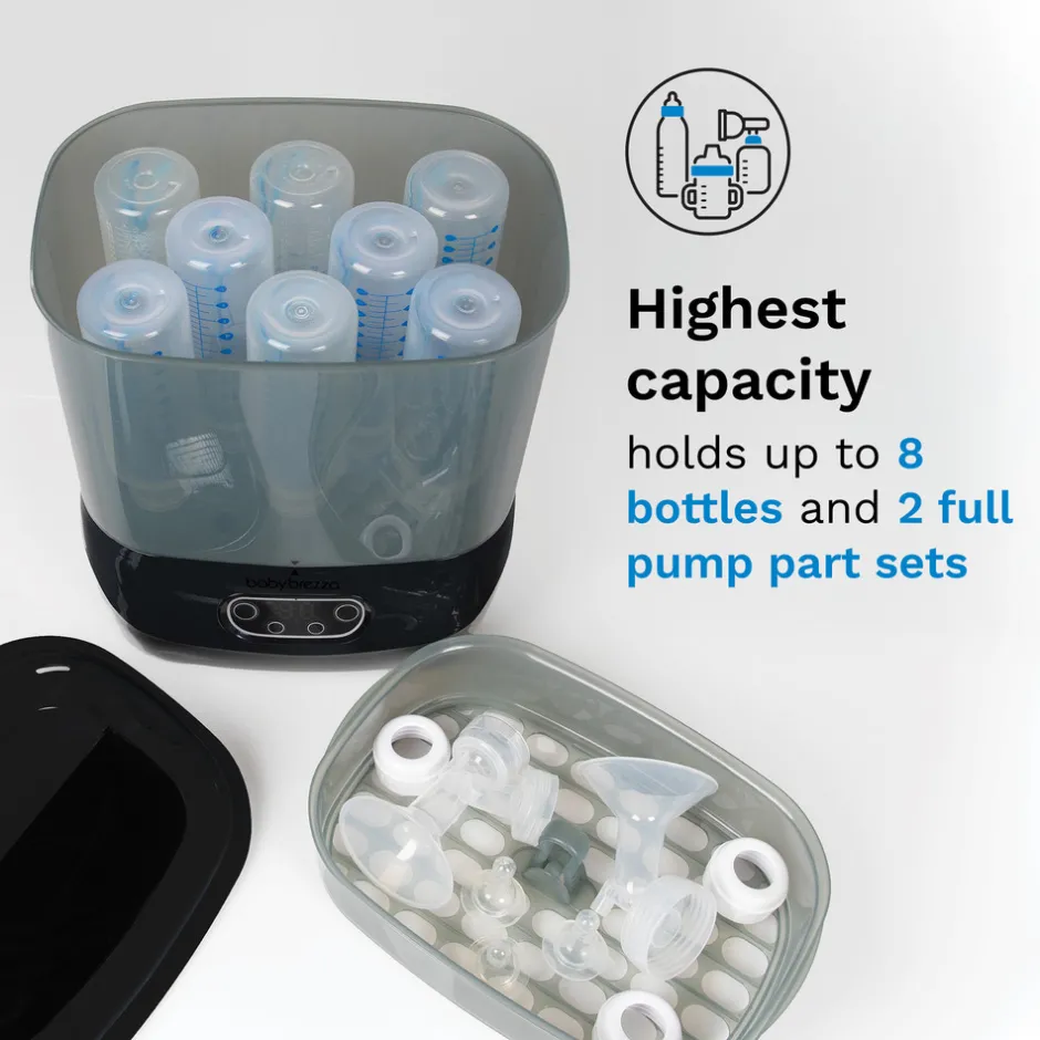 The Baby Brezza Sterilizer Dryer Advanced er den mest avancerede måde at sterilisere og tørre flasker, pumpedele og babytilbehør på. Dette revolutionerende apparat dræber 99,9% af bakterierne med naturlig damp og tørrer derefter automatisk 33% hurtigere. Det har den største kapacitet af alle sterilisatorer og kan rumme 8 flasker, 2 fulde sæt pumpedele, sutteflasker og tilbehør fra ethvert mærke. Og takket være HEPA-filtret tørrer det med 95% bakteriefri luft. Det er også modulært, så du kan bruge det på fire forskellige måder og vælge mellem fire funktioner: Sterilisator og tørretumbler, kun sterilisator, kun tørretumbler eller opbevaringsstativ. Nu kan du sterilisere og tørre dine babyprodukter på den EASY måde! BPA-fri. 2 års garanti.