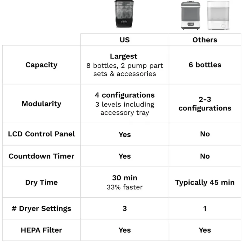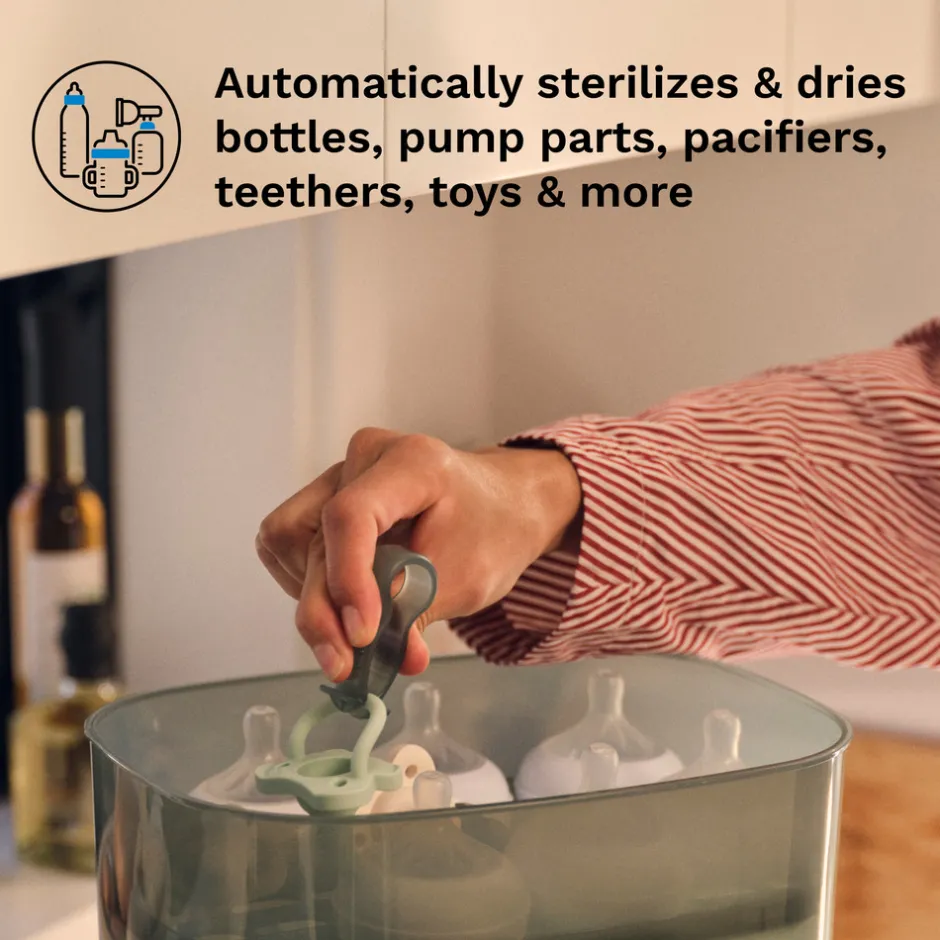 - Automatisk sterilisering og tørring: Spar tid ved at sterilisere og tørre alle mærker af flasker, pumpedele, sutter, bideringe, sippy-kopper, legetøj og andet tilbehør i ét enkelt trin.