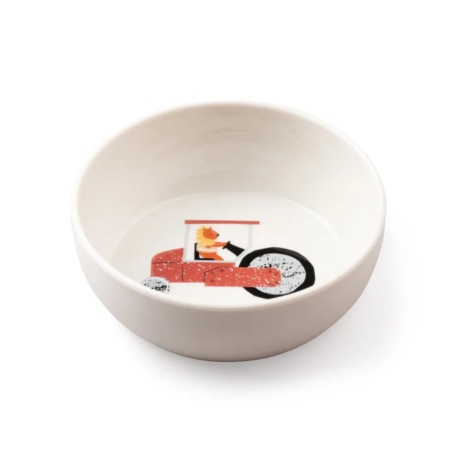 Sød babyskål med print af den seje løve fra Sebras tema Busy Builders – et byggeunivers fuld af sjov, aktivitet og begejstring over i fællesskab at få tingene til at ske og skabe noget stort.