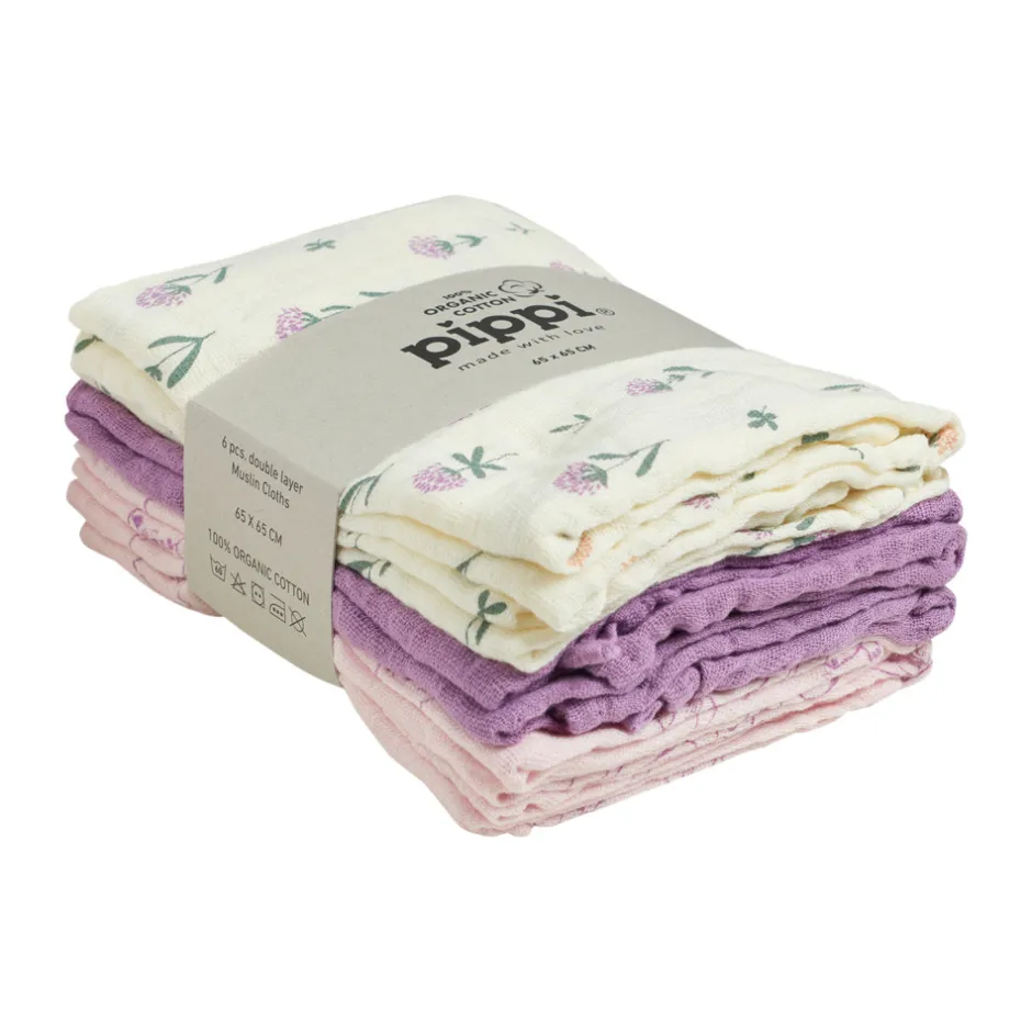 Seks skønne stofbleer fra Pippi, der er uundværlige i ethvert hjem med små børn. Stofbleerne har mange forskellige anvendelsesmuligheder, for eksempel som skifteunderlag på puslepuden, som beskyttelse mod gylp og meget mere.
