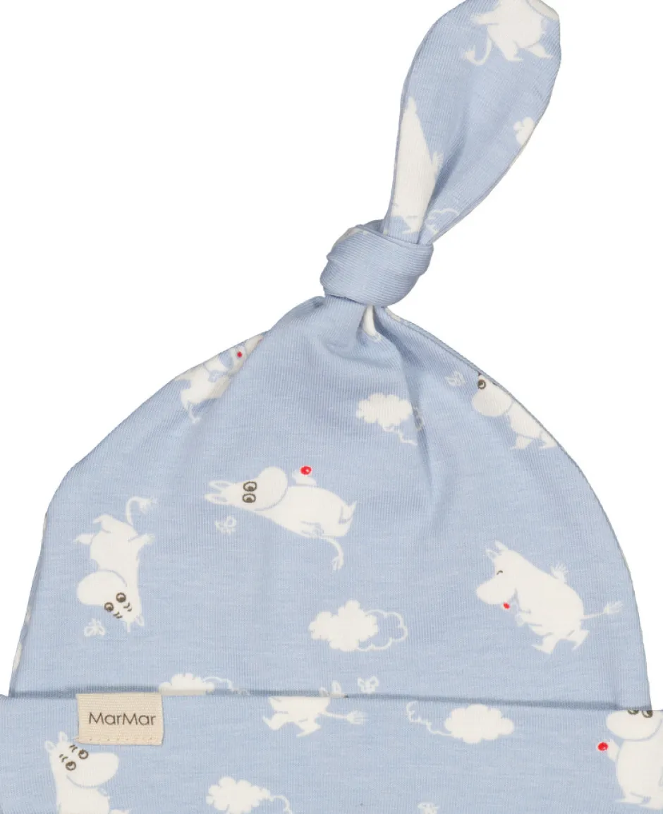 Lille hue med Moomin print til nyfødt med kant der kan foldes ned og med en sød knude på toppen. Huen er både blød, strækbar og behagelig at have på.
