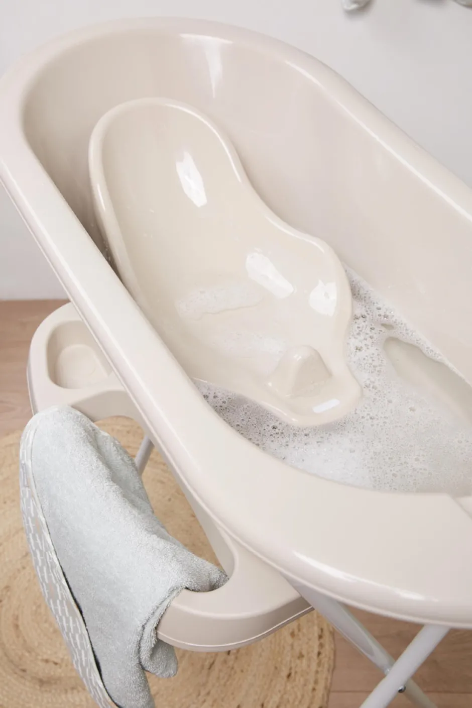 Den nye og sikre badestol til nyfødte hjælper med til, at du kan holde begge hænder frie til at pusle din baby. Stolen giver en komfortabel og sikker støtte således at babyen ikke kan glide væk.