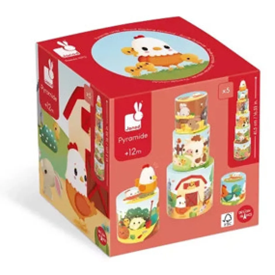 De 5 gårdtematiske former, der udgør pyramiden, er fyldt med illustrationer af grise, køer, kaniner og selve laden… alle gårddyrene er kommet ud for at lege. En yndig træfigur af en hønemor, der leder efter sine kyllinger, som er løbet væk for at udforske gården, er også inkluderet. Du kan gemme figuren under de forskellige kuber og lade børn fra 1 år og opefter finde den, eller opfordre dem til at finde alle kyllingerne, der er afbildet.