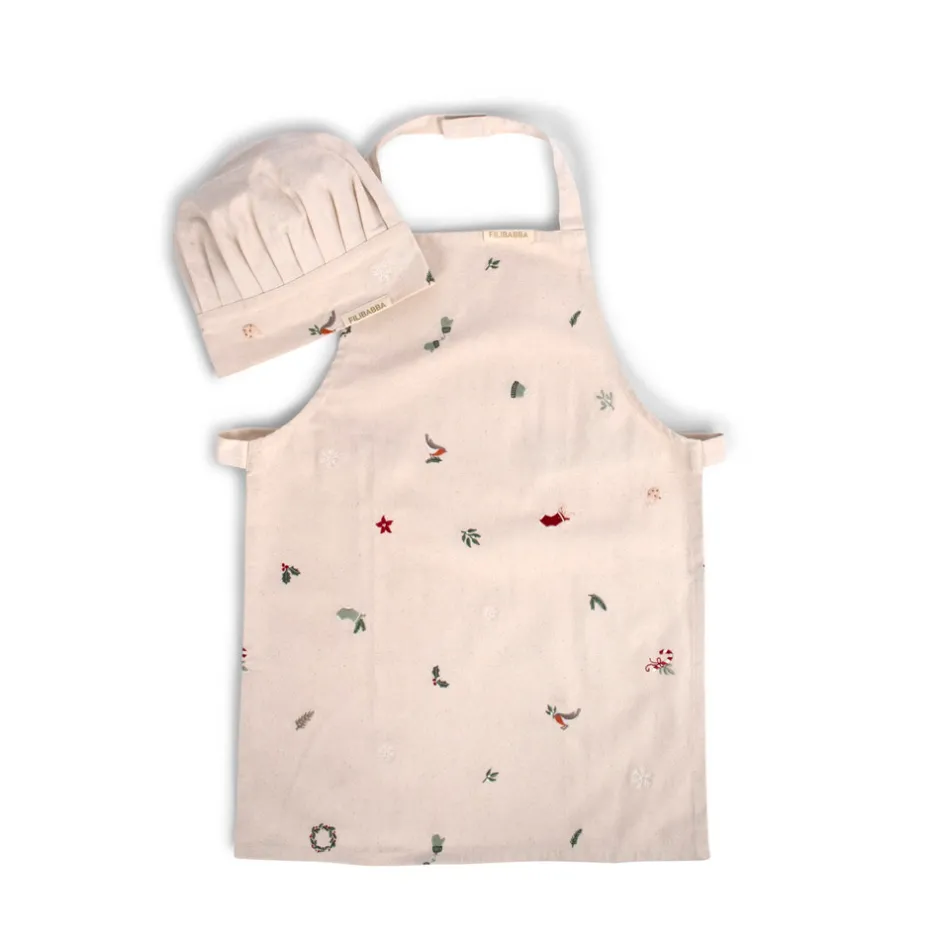 Uanset om du bager i dit legekøkken eller låner de voksnes, skaber dit eget kokkesæt af ufarvet GOTS-certificeret økologisk bomuld stor glæde. Både forklæde og hue er broderet med sirlige vintermotiver og passer perfekt til vores småkagestempel.