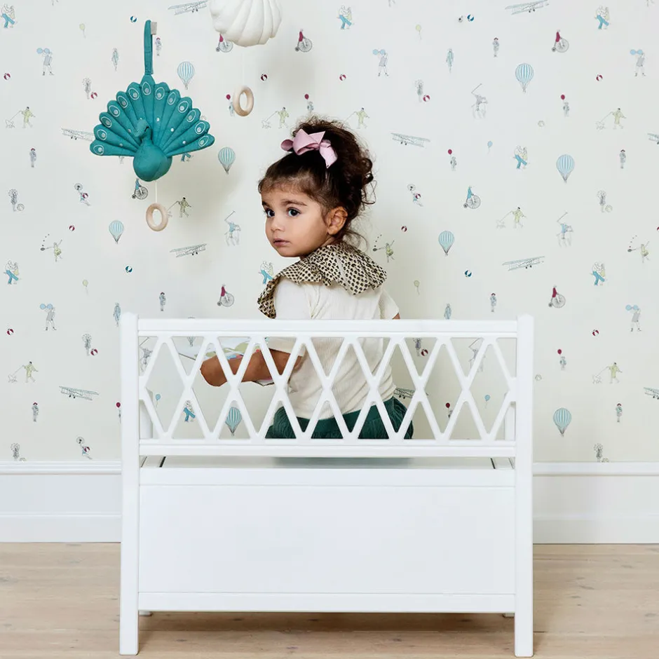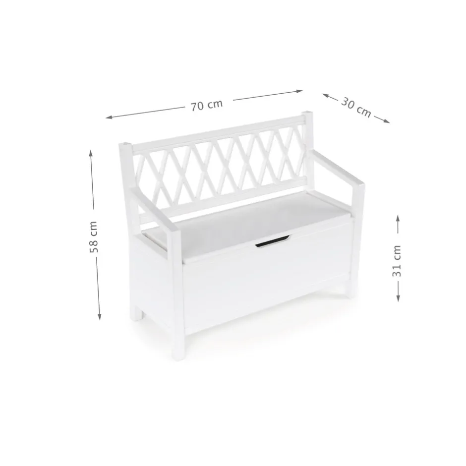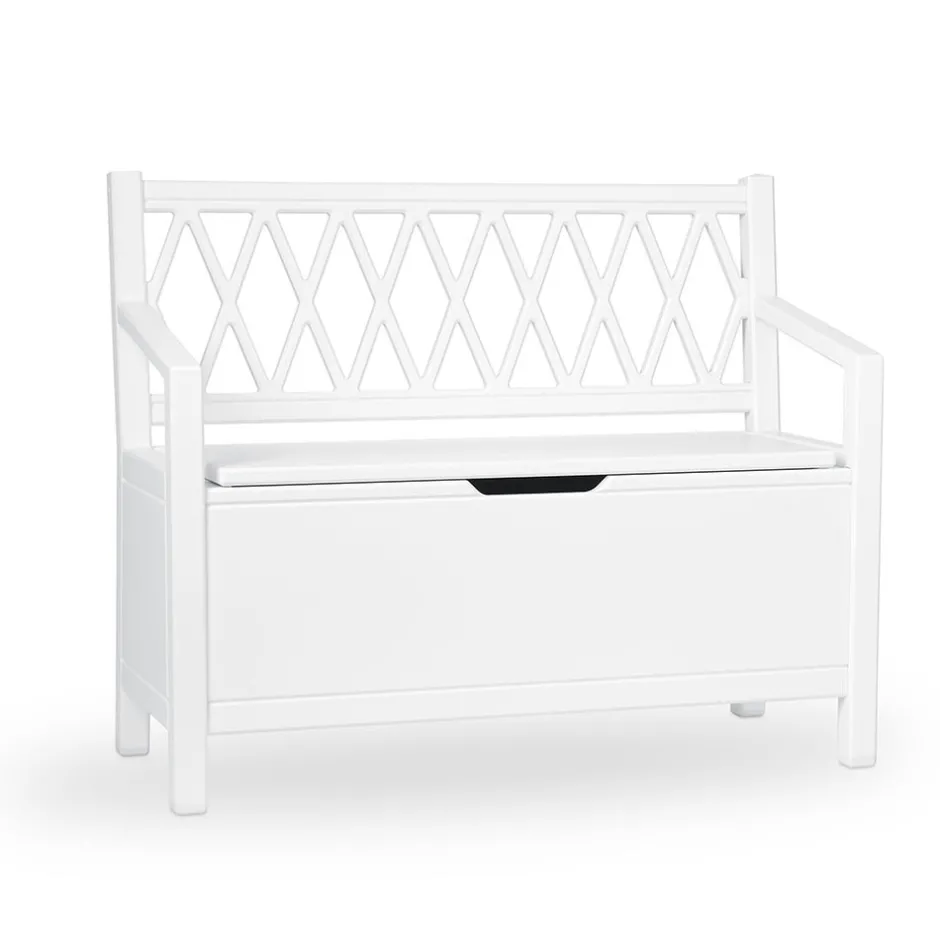 Harlequin bænken til børn fra Cam Cam Copenhagen har et moderne og klassisk look og kommer i flere fine farver. Navnet på møbelserien stammer fra det udskårede rombeformede mønster, vi kender fra den klassiske ballet om Pjerrot, Harlequin og Columbine. Bænken er et opbevaringsrum under sædet. Sædet har en glat lukning, hvilket sikrer, at de små fingre aldrig kommer i klemme. Sædet åbner op, så du kan opbevare legetøj i rummet nedenfor. Den er meget stabil og robust på grund af konstruktionen og dimensionerne. Fladpakket. let at samle. Miljøvenlig produktion og produceret under socialt ansvarlige forhold.