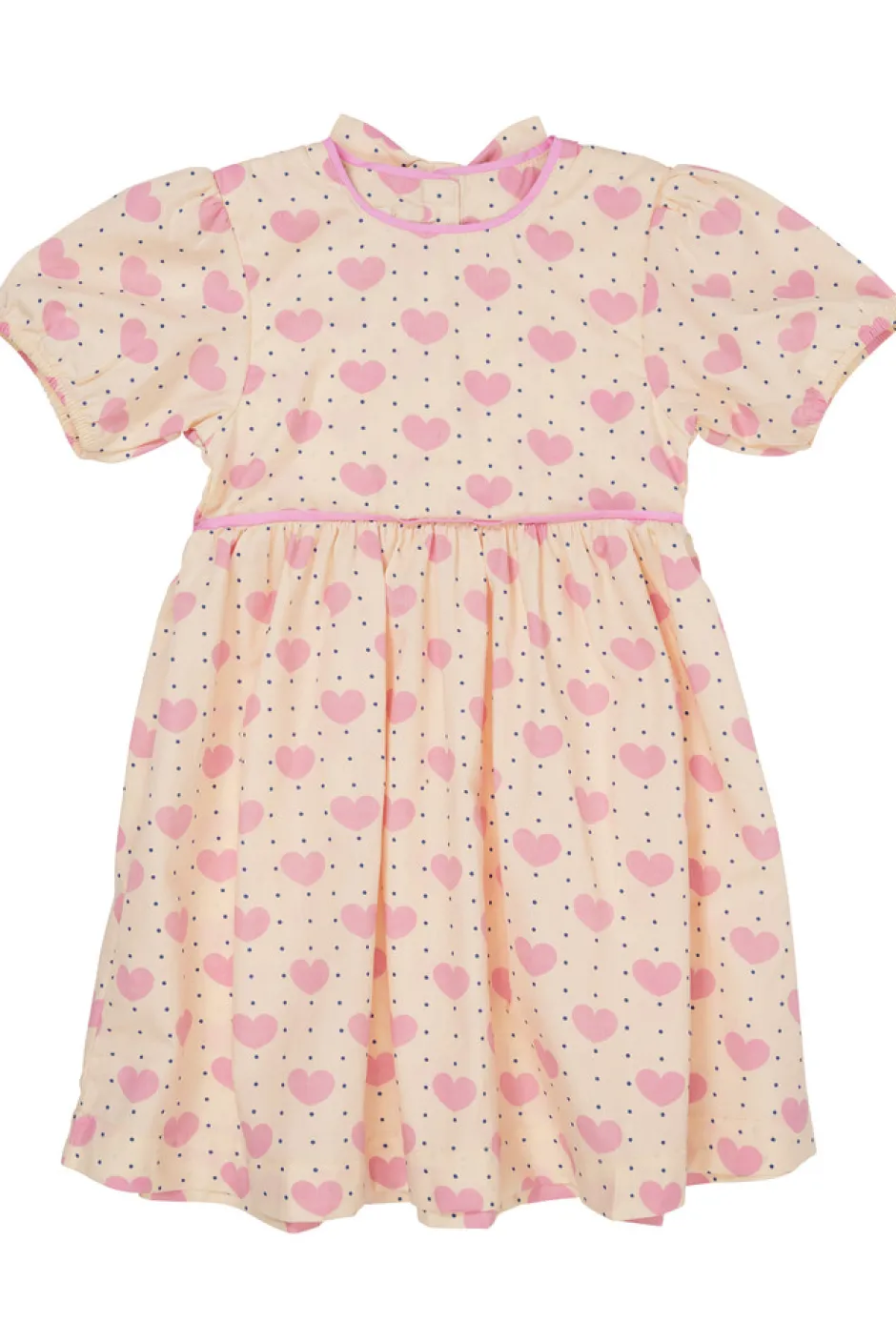 Tilføj et strejf af charme til enhver lejlighed med denne yndige Heart & Dots-kjole med hævede ærmer. Denne kjole er lavet af blødt, åndbart stof og kombinerer legende hjerte- og prikmønstre med et finurligt ærmedesign.