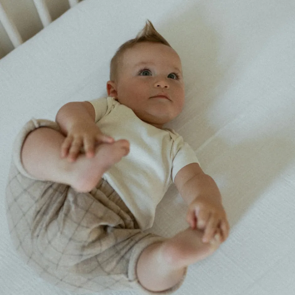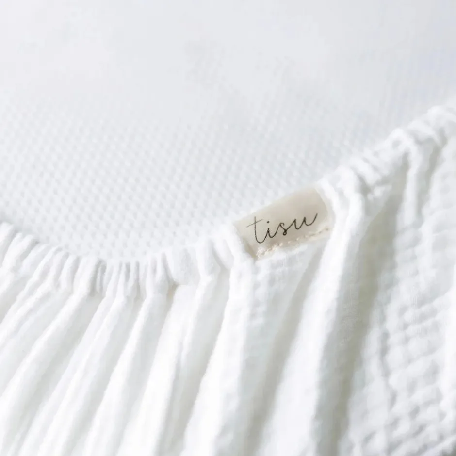 TISU lagner er lavet af superblødt musselinstof, der bliver blødere for hver vask. Elastikken holder lagenet på plads, selvom babyen vender sig. Lagnerne er lavet af åndbar bomuld, der absorberer fugt.