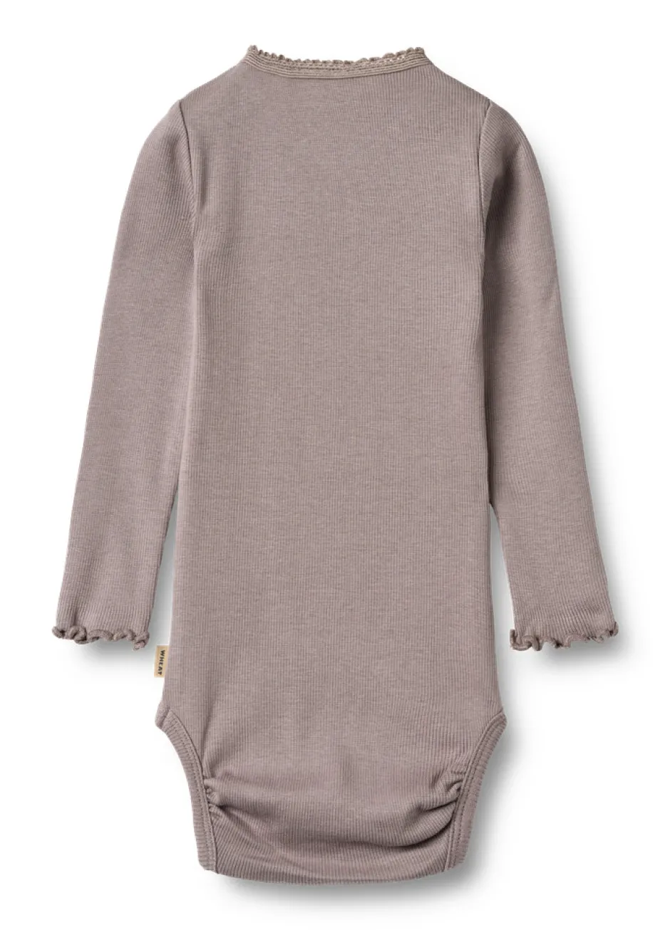 Skøn langærmet rib body i økologisk bomuldsblanding til din baby. Wheats skønne bodyer er designet til unisex og er en sand klassiker i ethvert hjem med småbørn. Denne body har trykknapper på den ene skulder samt i bunden for bedre komfort, når du skal klæde dit barn på. Brug bodyen som den inderste del i ethvert outfit, da den er blød at have tæt på huden.