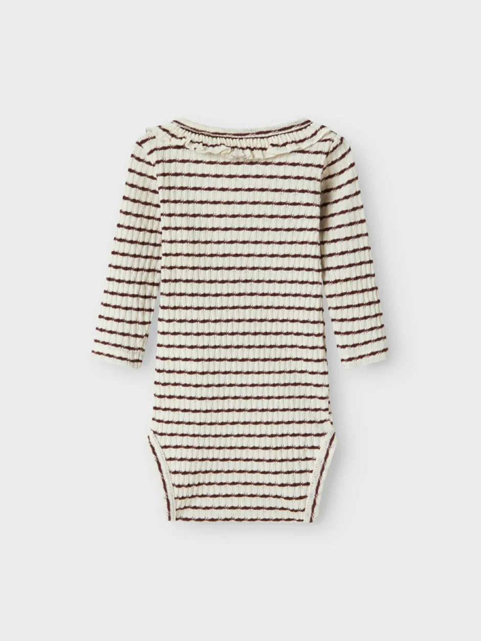 Sæt det perfekte outfit sammen til dit barn med kvalitetsstyles til hverdagen, og skab et behageligt og trendy look.Jersey er et let og elastisk stof med en blød overflade og inderside, der giver en behagelig fornemmelse og bevægelsesfrihed. – Produkttype: Bodysuit – Halsudskæring: Rund halsudskæring – Ærmer: Lange ærmer (L/S) – Lukning: Trykknaplukning – Ekstra detaljer: Flæser, mærke – Advarsel: ADVARSEL! Holdes væk fra ild