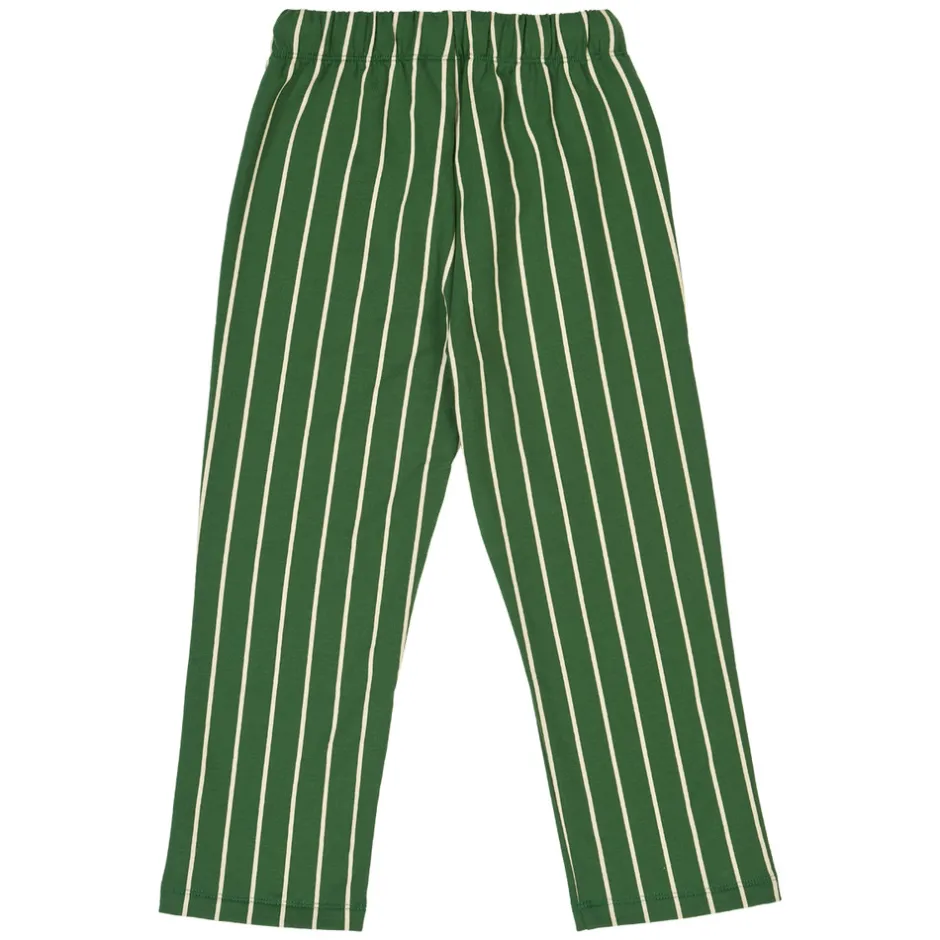Disse smarte og friske sweatbukser kommer i en flot grøn farve med lodrette cremefarvede striber, der giver et sporty og moderne udtryk. Bukserne har elastik og bindebånd i taljen for en justerbar pasform samt praktiske sidelommer.