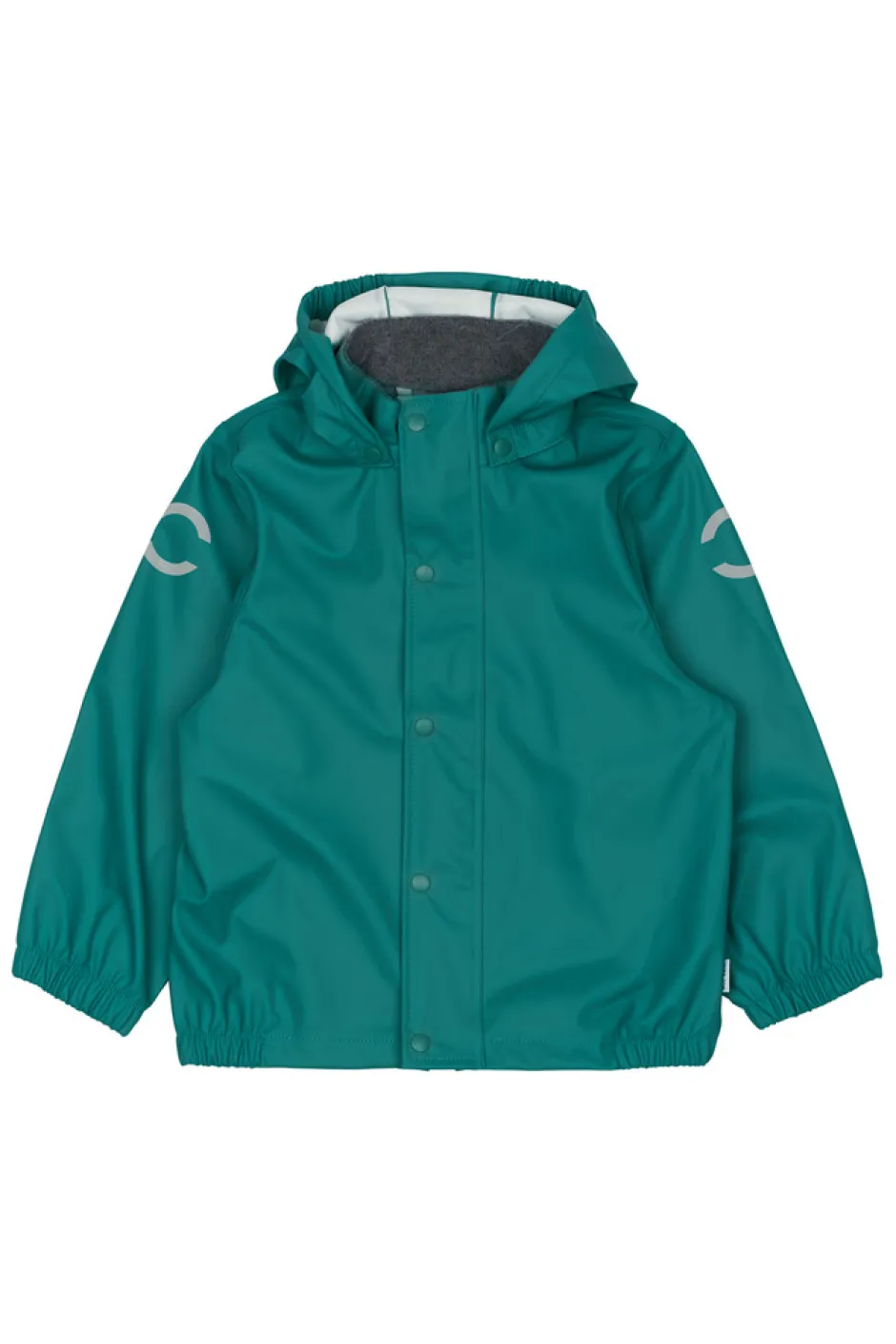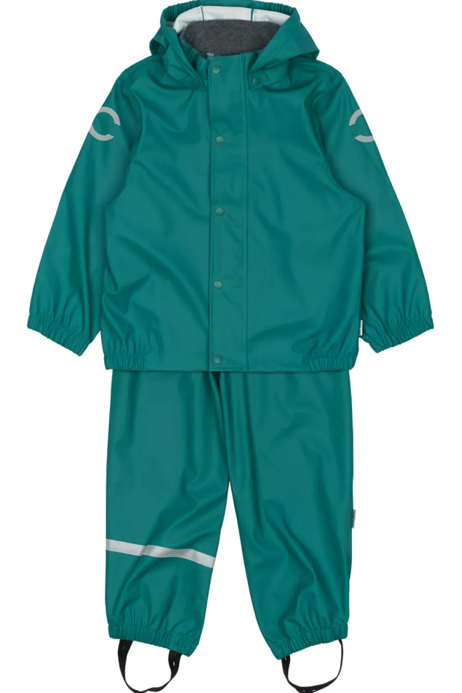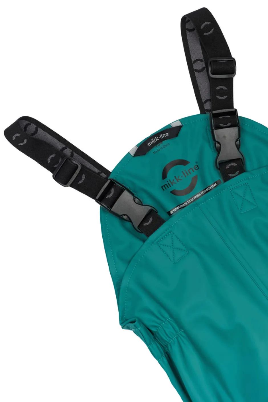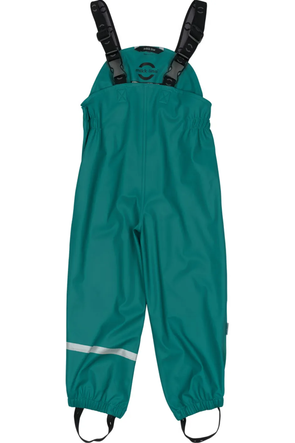 Praktisk og funktionelt recycled regnsæt fra mikk-line, der holder dit barn tørt. Regntøjet er udstyret med refleksdetaljer så dit barn kan færdes sikkert i mørket. Regnsættet er naturligvis både vand- og vindtæt. Sømmene er svejsede, hvilket forhindrer vand i at trænge igennem samlingerne. Buksen har fodstropper, som holder buksen under gummistøvlen. Regnbukserne har justerbare seler, tætsiddende elastik i taljen og et ekstra stykke stof der dækker både foran og bagpå kroppen.