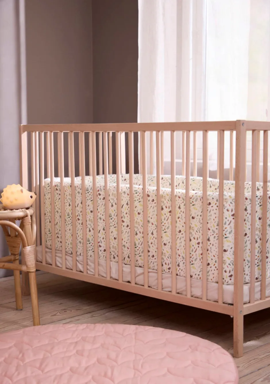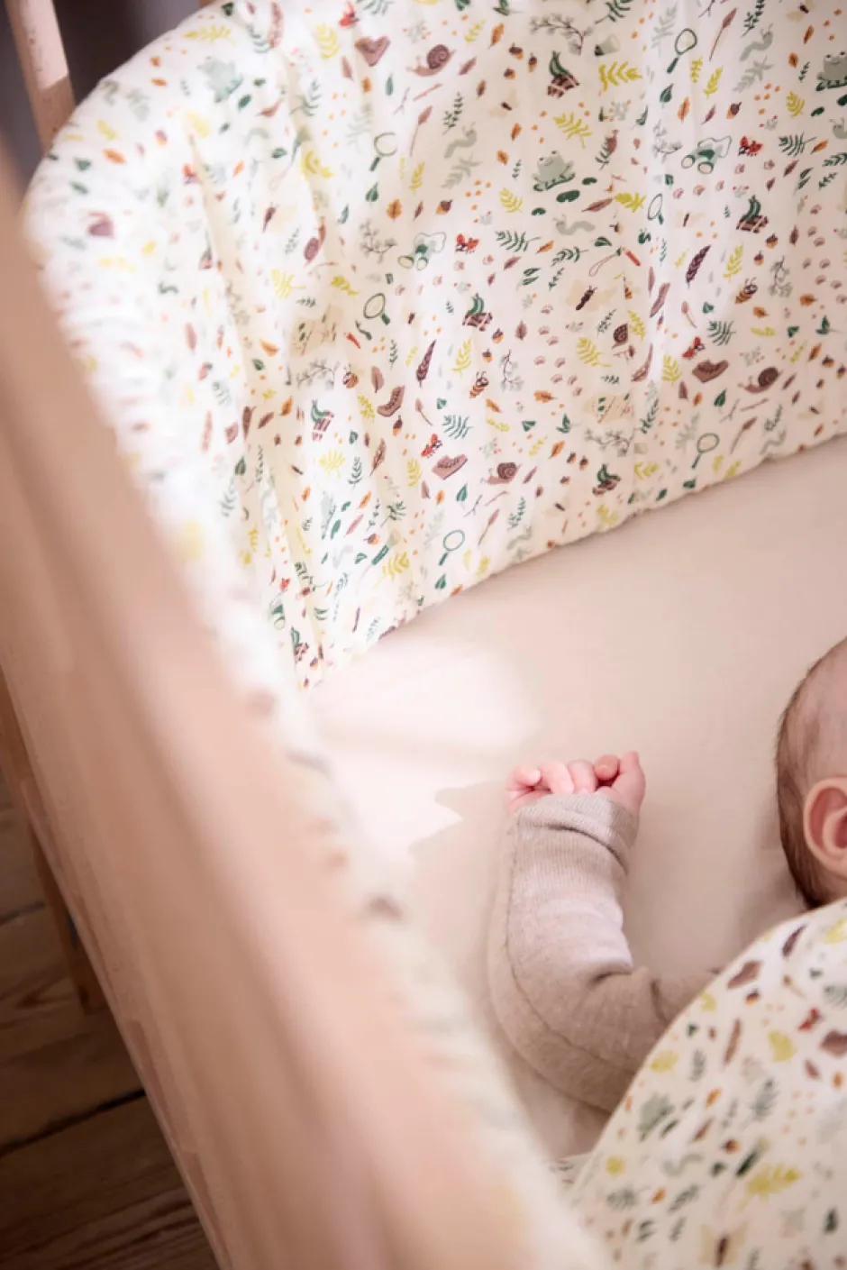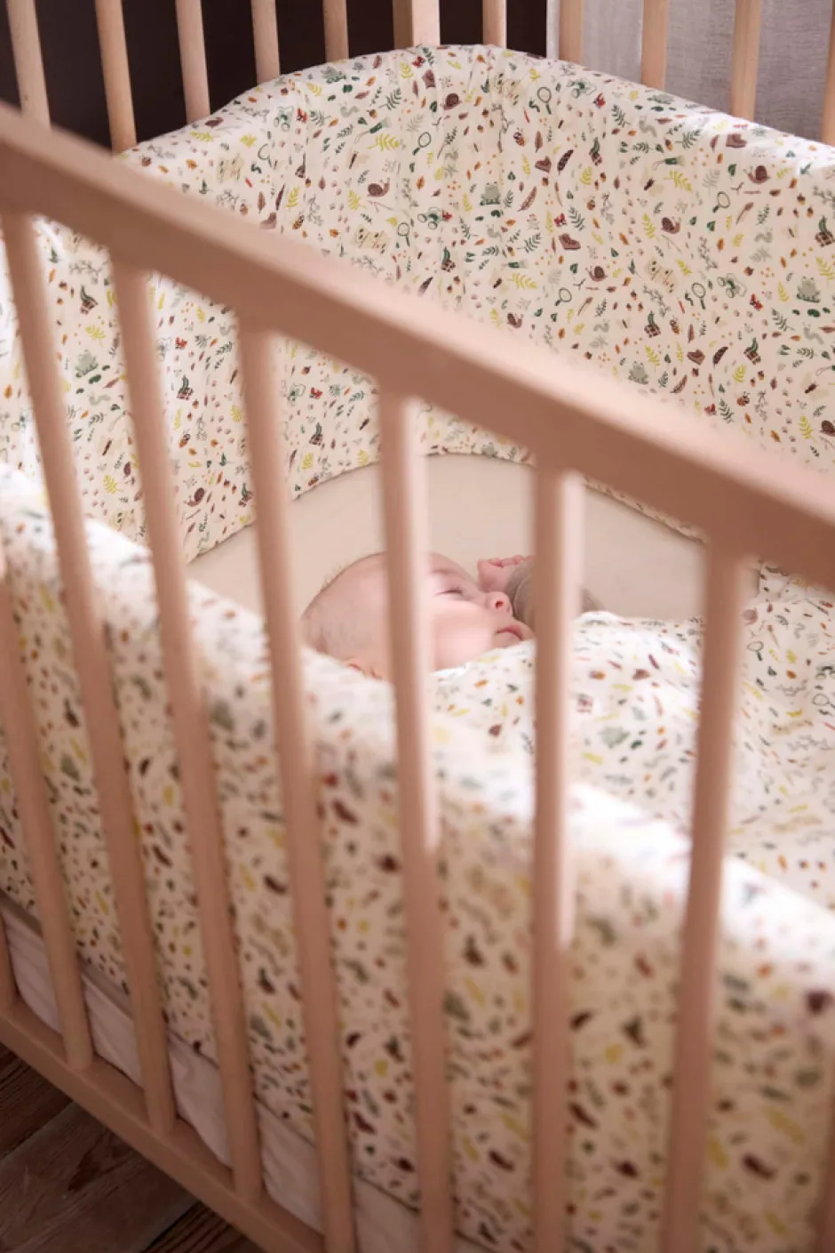 Forældre bruger meget tid på at hjælpe vores kære små med at falde i søvn, og findes der egentlig en bedre måde at slutte dagen på end at blive puttet ned i små glimt af glæde med et kys? Sengerand er designet til at skabe en hyggelig stemning i enhver krybbe og tremmeseng. Hvis din seng er mindre, skal du blot lægge sengerandens ender over hinanden. Den 4 cm tykke polyesterskumkerne hjælper sengeranden med at stå oprejst, så du ikke skal fastgøre den til sengen med f.eks. bånd. Derudover sikrer den ekstra tykke kvalitet, at din baby ikke slår hovedet ind i sengens hårde tremmer. Den integrerede lynlåsfunktion hjælper dig med at tage betrækket af, så du kan vaske det efter behov. Husk at trække betrækket i form og putte det direkte på skumkernen efter i vask. Lad betrækket tørre på sengeranden for at mindske risikoen for, at det krymper.