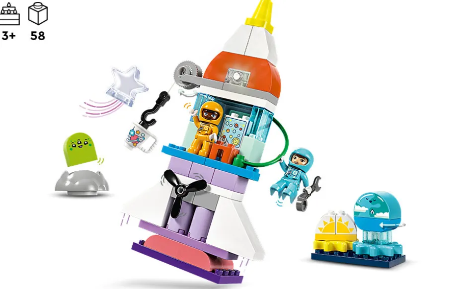 Drøn afsted på en rummission med dit lille barn. Dette 3-i-1-raketsæt 10422 fylder legetiden med intergalaktisk sjov, når de mindste modigt drager ud på søgen efter venlige rumvæsener. Børnehavebørn fra 3 år udvikler sig og styrker finmotorikken og selvudfoldelsen gennem kreativ rolleleg. Det alsidige legetøjsrumskib kan ombygges til 2 andre fartøjer, så der altid er et nyt eventyr klar til at blive sendt i kredsløb!