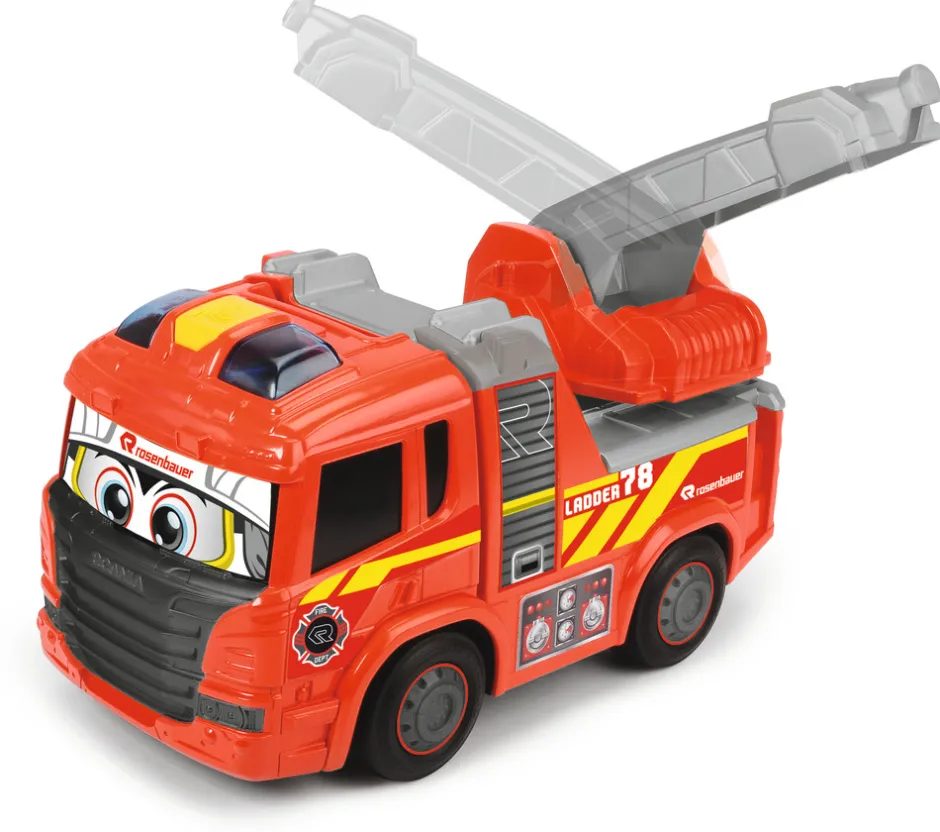 Scania brandbil fra ABC med frihjul, lys, lyd og stige der kan svinges til siderne. Motoriseret kørsel frem/tilbage. 25 cm. Fra 2 år.