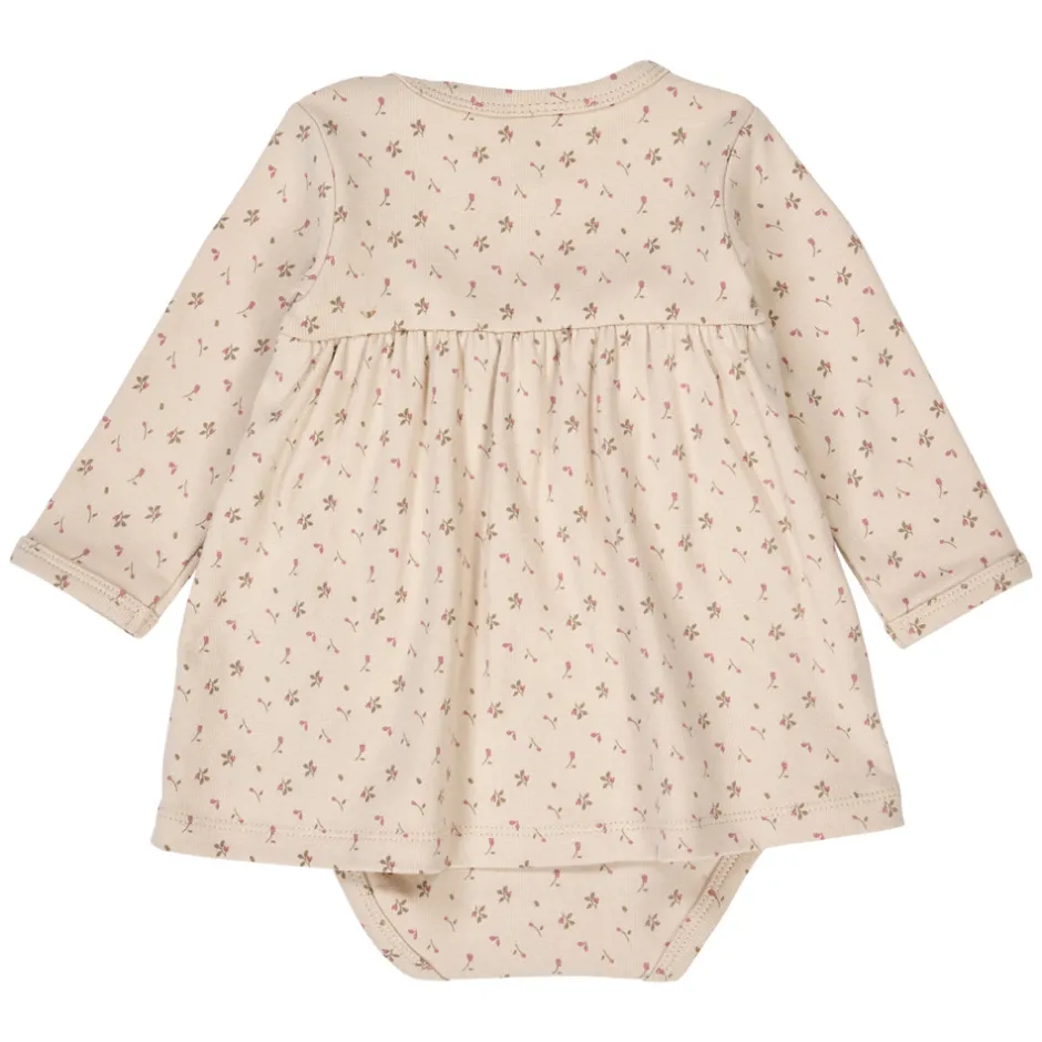 Denne skønne bodykjole kombinerer det praktiske med det festlige. Den har et diskret og smukt blomsterprint over hele kjolen og lange ærmer, der gør den perfekt til både hverdag og særlige lejligheder. Kjolen åbnes nemt med trykknapper i halsudskæringen og forneden.