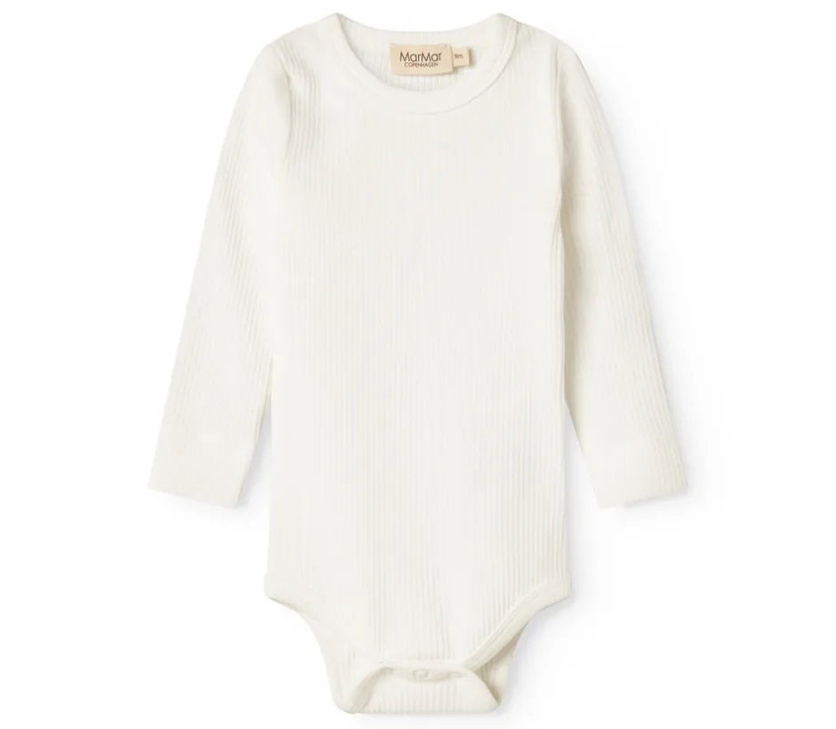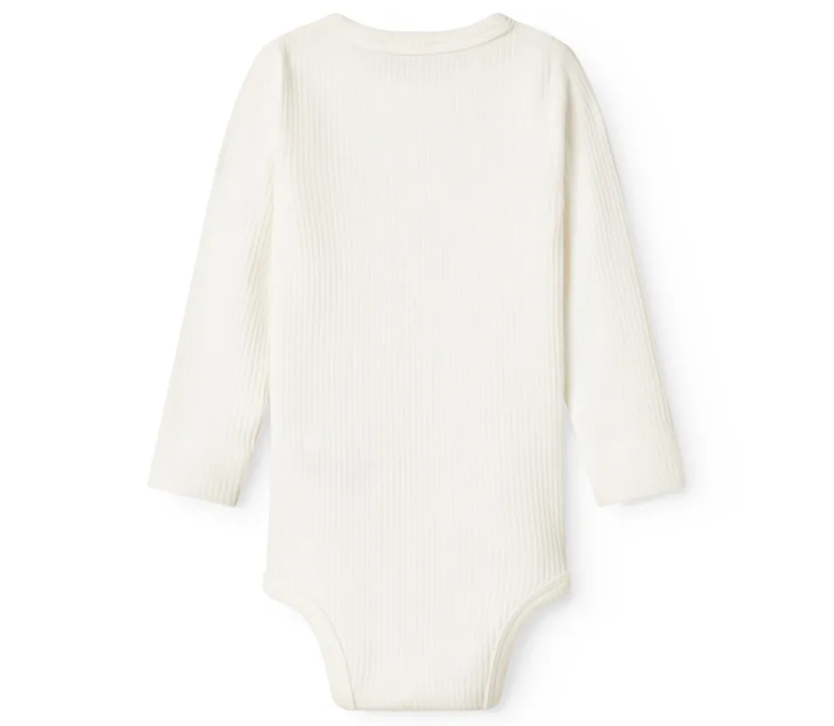 Langærmet babybodystocking i blød modal. Denne enkle og komfortable bodystocking med lange ærmer er fremstillet i ribstrikket modal med elastan, hvilket gør den både strækbar og behagelig for barnet at have på. Den lukkes praktisk mellem benene, hvilket gør bleskift nemt og hurtigt.