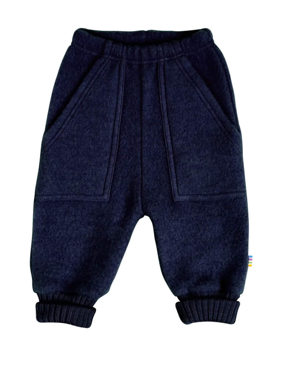 Baggy bukser. Blød elastik i taljen. Store sidelommer som sød detalje. Har bred ribkant i benene som kan foldes ned, så banet kan bruge buksrne længere. En kraftigere børstet uldkvalitet som er ekstra blød og lækker.
