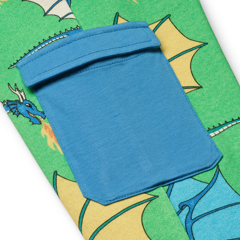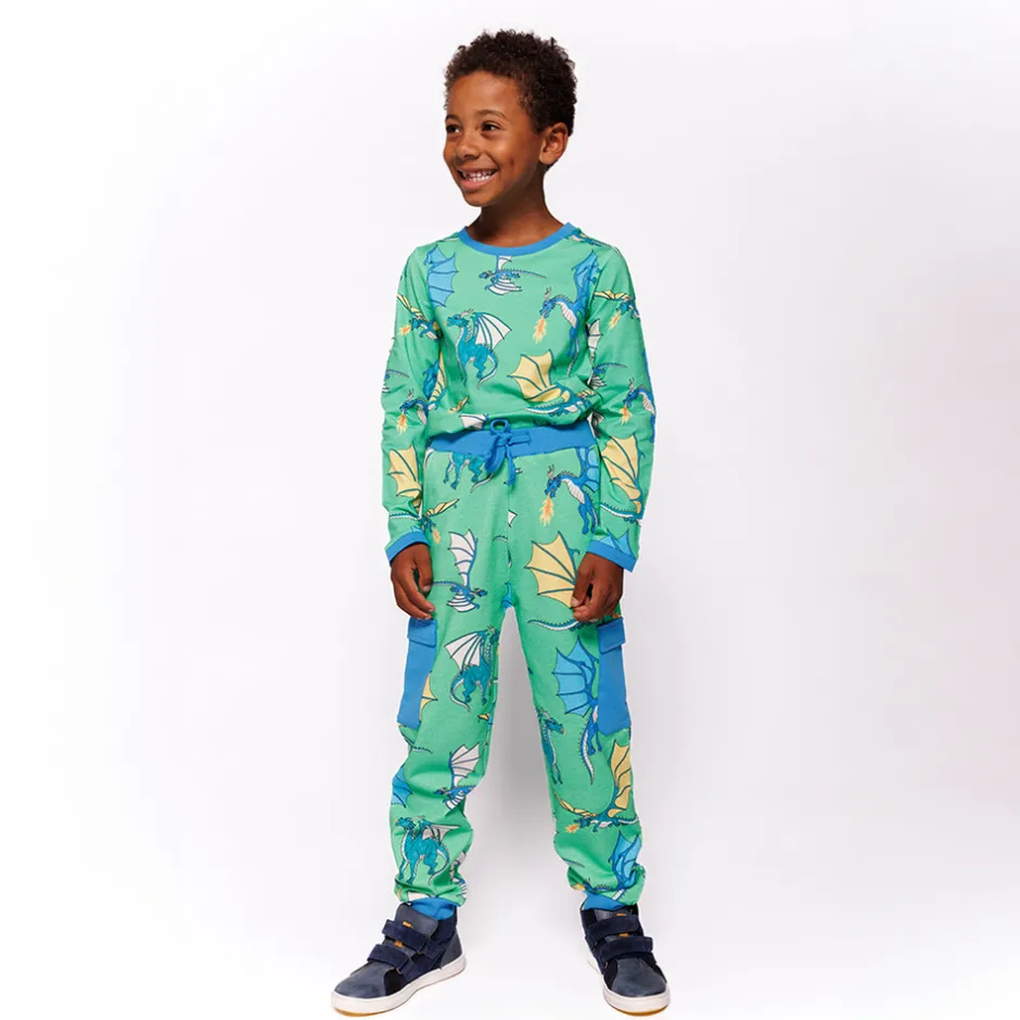 Bukser i et ubørstet sweat materiale med flyvende drager, produceret i 100% økologisk bomuld. Bukserne har en afslappet pasform med almindelige buede lommer foroven og cargo-stilet lomme med flap på begge sider af benene. Bukserne har ribkant i taljen med elastik og snore til justering, samt ribkant i manchetter.