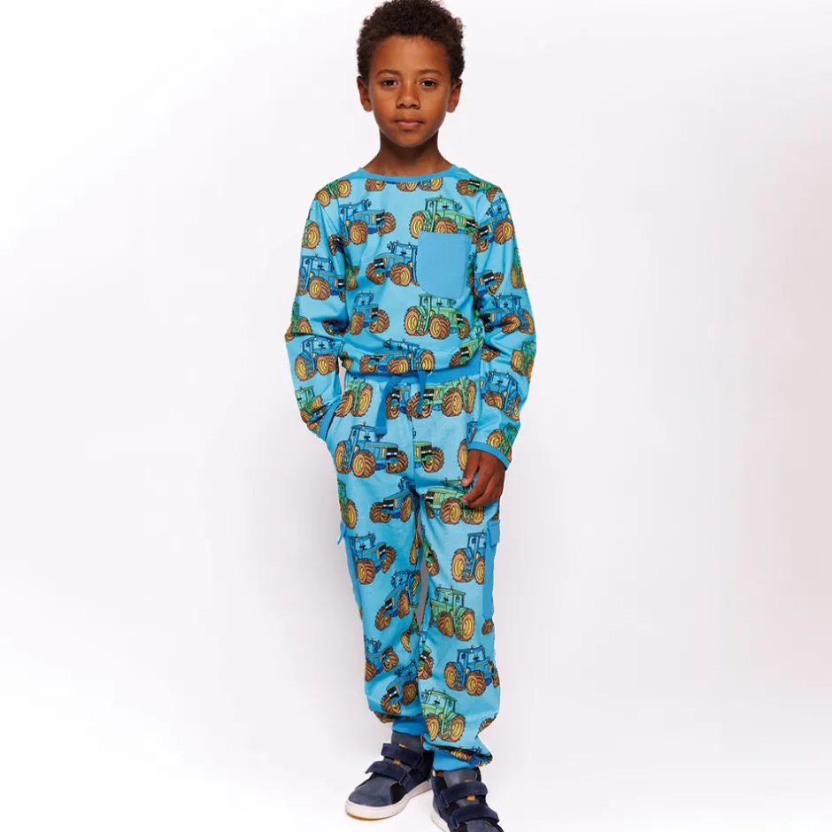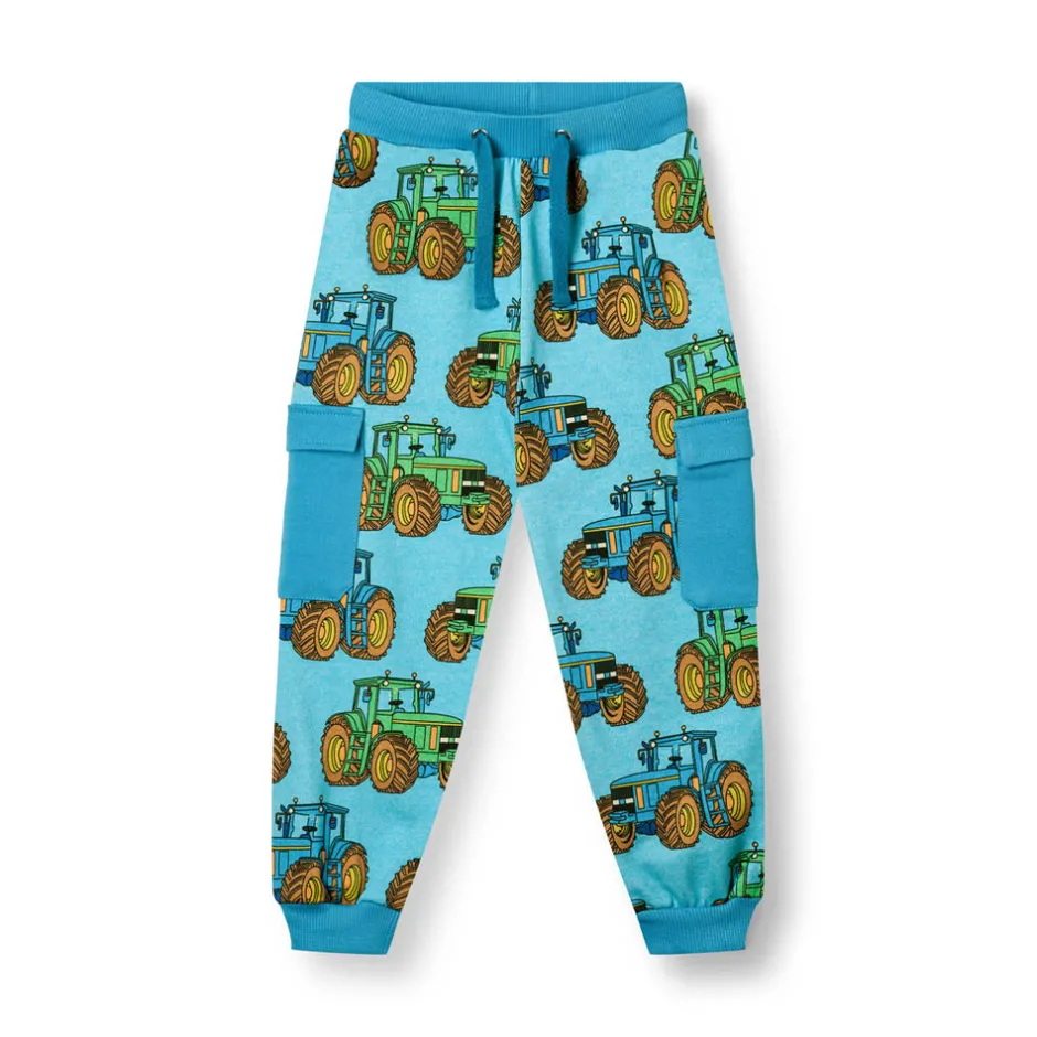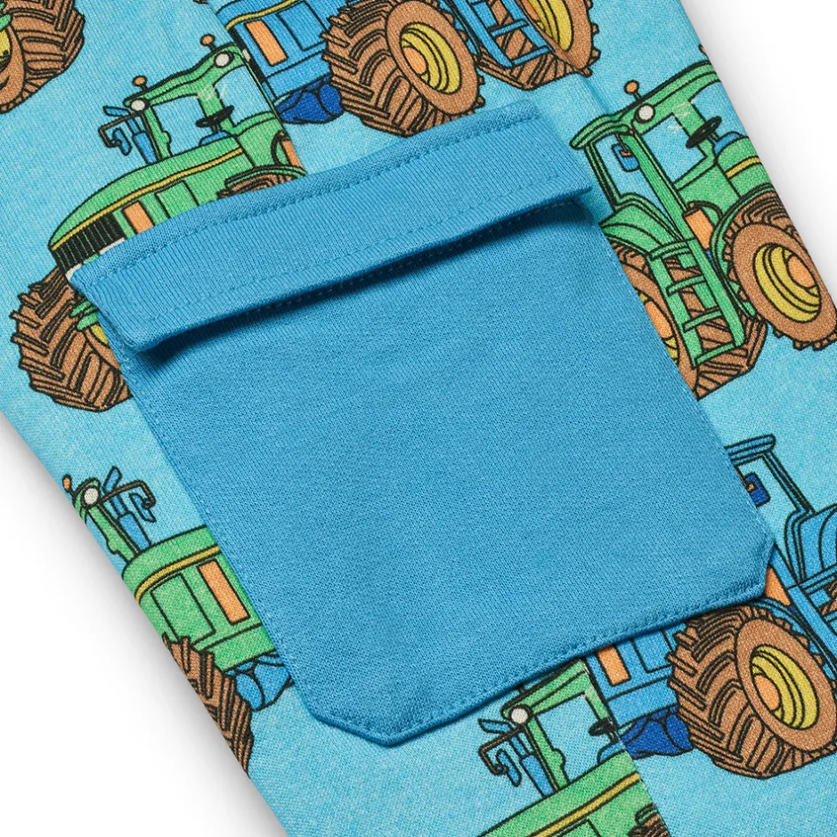 Bukser i et ubørstet sweat materiale med traktorer, produceret i 100% økologisk bomuld. Bukserne har en afslappet pasform med almindelige buede lommer foroven og cargo-stilet lomme med flap på begge sider af benene. Bukserne har ribkant i taljen med elastik og snore til justering, samt ribkant i manchetter.