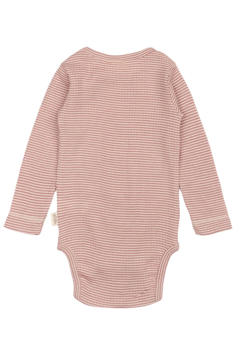 Denne langærmede body i blød merinould er designet med fine striber og fokus på både komfort og funktionalitet. Ved venstre side af halsåbningen finder du vores karakteristiske trykknap, som gør det nemt at tage bodyen af og på. Nederst lukkes den med tre praktiske trykknapper, der gør bleskift hurtigt og nemt. Det strækbare og bløde materiale giver maksimal bevægelsesfrihed – perfekt til aktive småbørn.