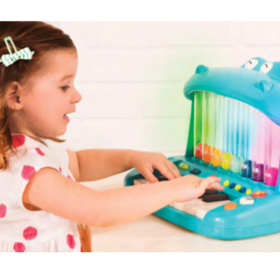 Man kan ikke andet, end at blive vild med dette sjove flodhesteklaver fra Land of B. Klaveret er fuld af en masse forskellige lyde og effekter. Du kan spille din helt egen melodi eller vælge en af de 15 melodier. Der er 26 fjollede lydeffekter, 5 forskellige lydindstillinger og se de skøre fugle poppe op når du trykker på tangenterne.