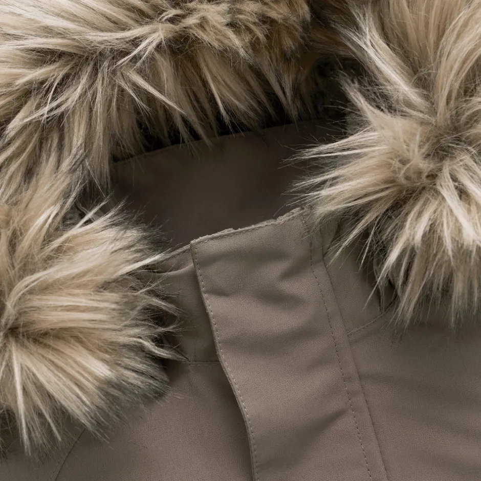 Flyverdragten lukkes med en solid lynlås foran samt lynlåse ved de udvendige lommer. En hagebeskytter forhindrer irritation under hagen, og den aftagelige hætte giver fleksibilitet i skiftende vejr. Flæsedetaljer på skuldrene og langs ærmernes skæring foran og bagpå tilføjer et feminint og dekorativt præg.