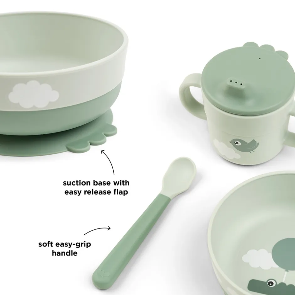 Små børn vil elske at få serveret et måltid i dette fine Foodie første spisesæt med et legende motiv. Den praktiske, skridsikre bund sørger for, at skålen bliver, hvor den skal, og skeens easy grip-belægning giver et godt greb mens babyen mades.