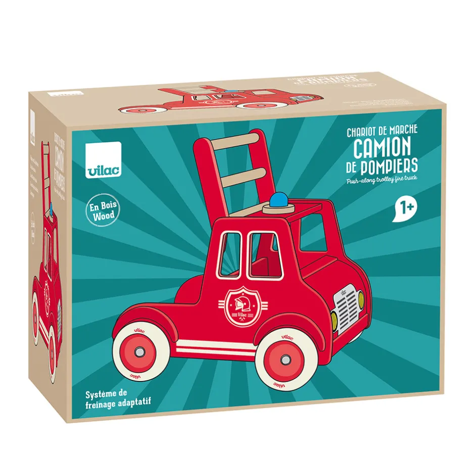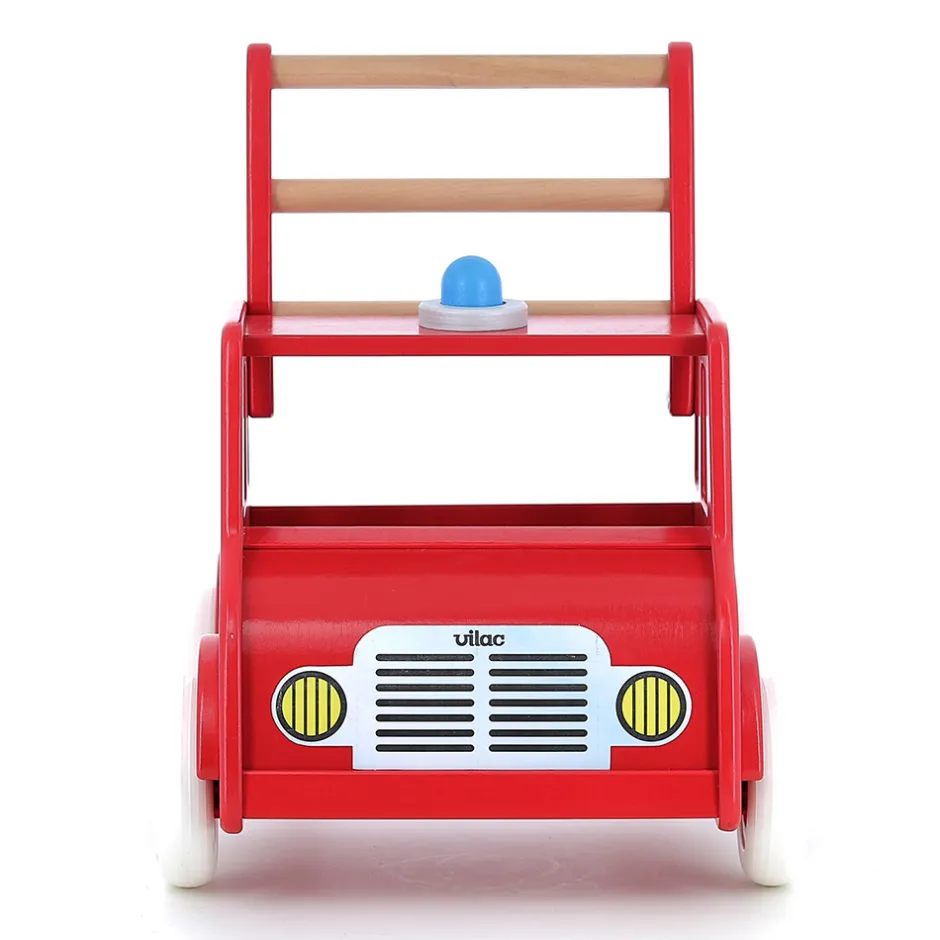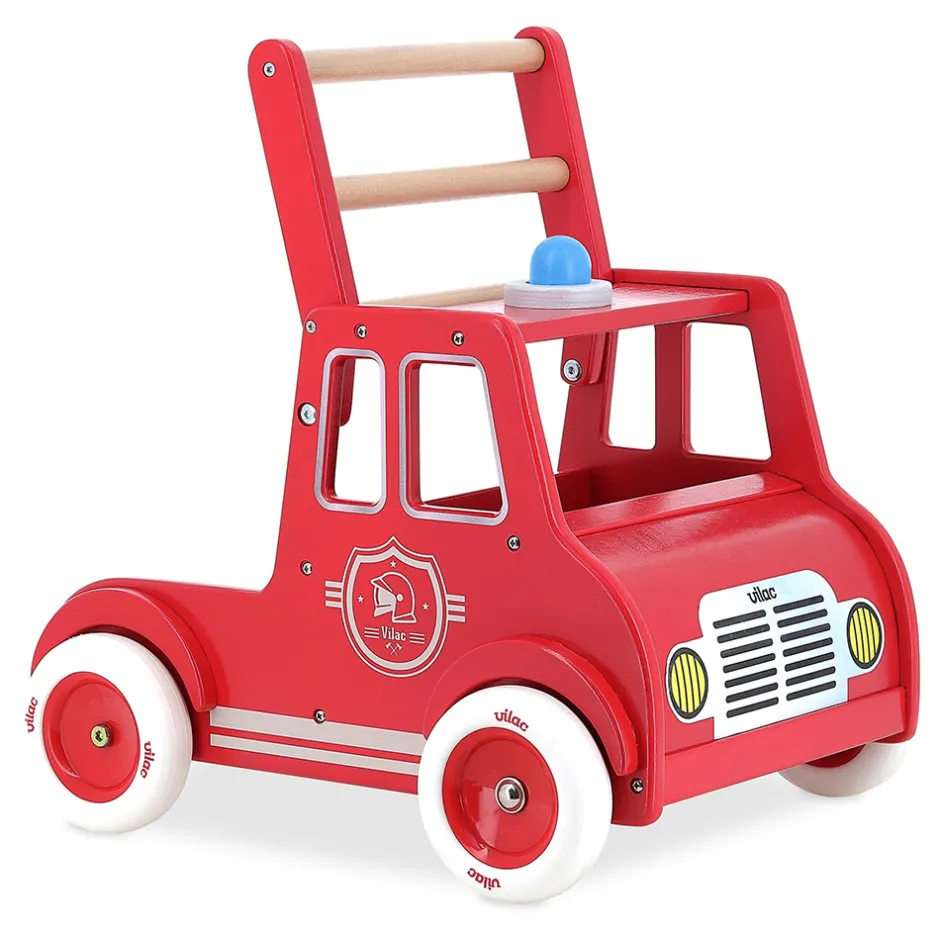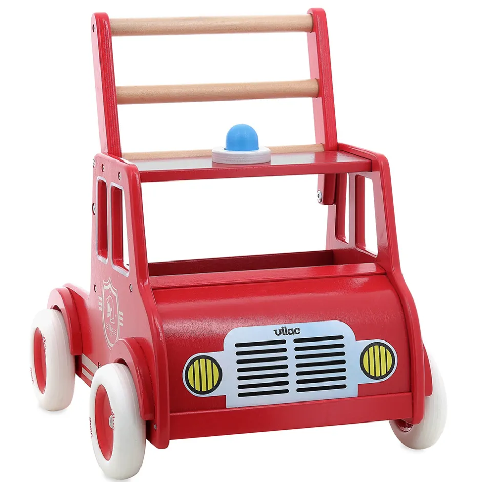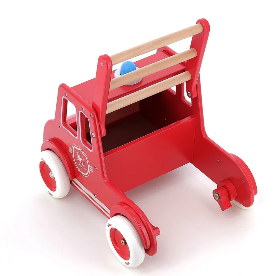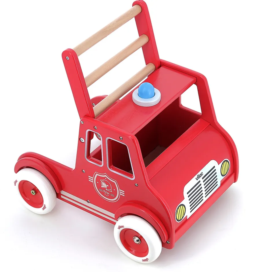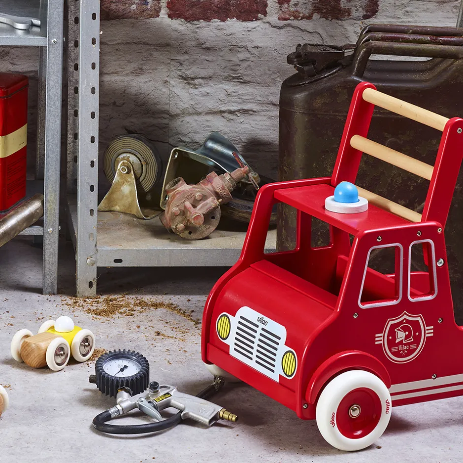 Med sit vintage brandbil-look er denne gåvogn i træ ideel til de barnets første ture.