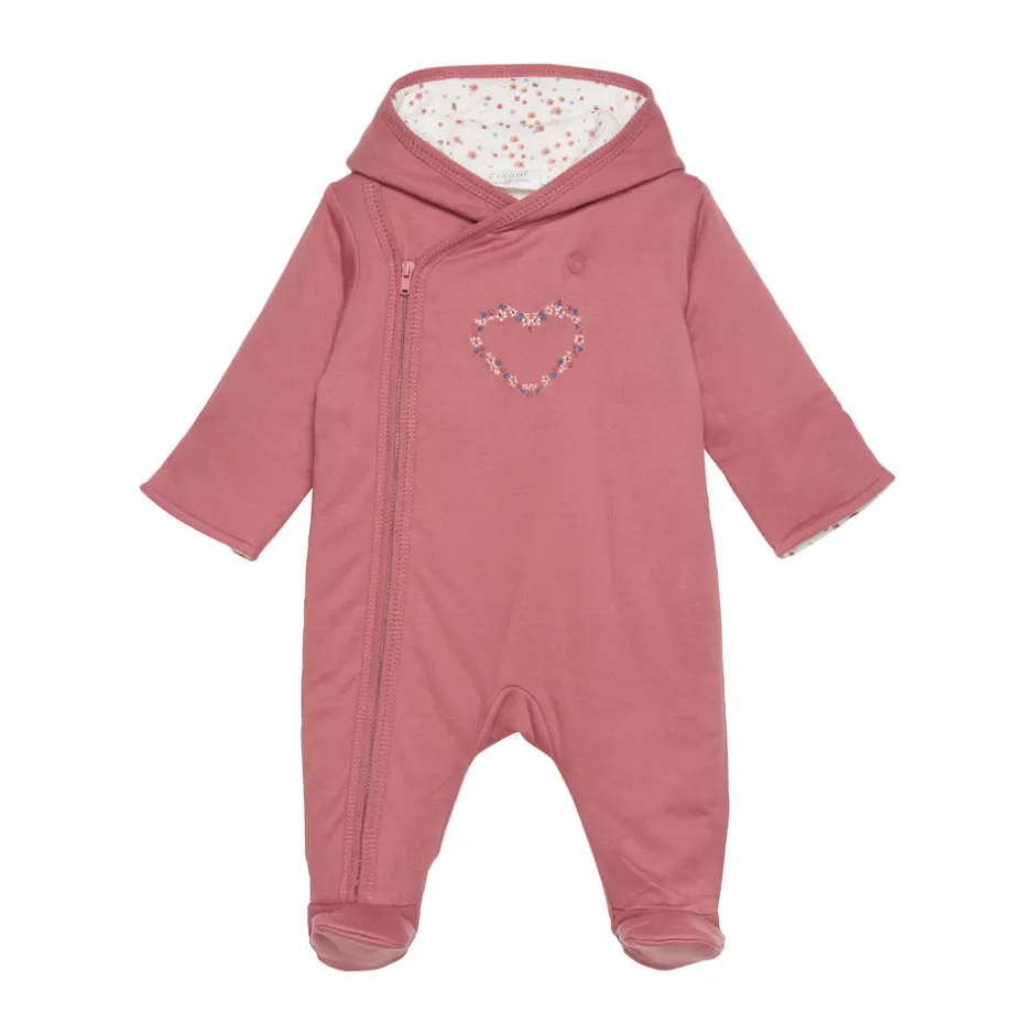 Vatteret heldragt med print på brystet. Dragten har påsyede fødder og fold, der kan lukkes om fingrene. Fast hætte. Lukkes med trykknapper langs den ene side samt en trykknap øverst. Certificeret i hht. STANDARD 100 by OEKO-TEX® cert. nr. SH020 156011 TESTEX, tiltro til tekstiler