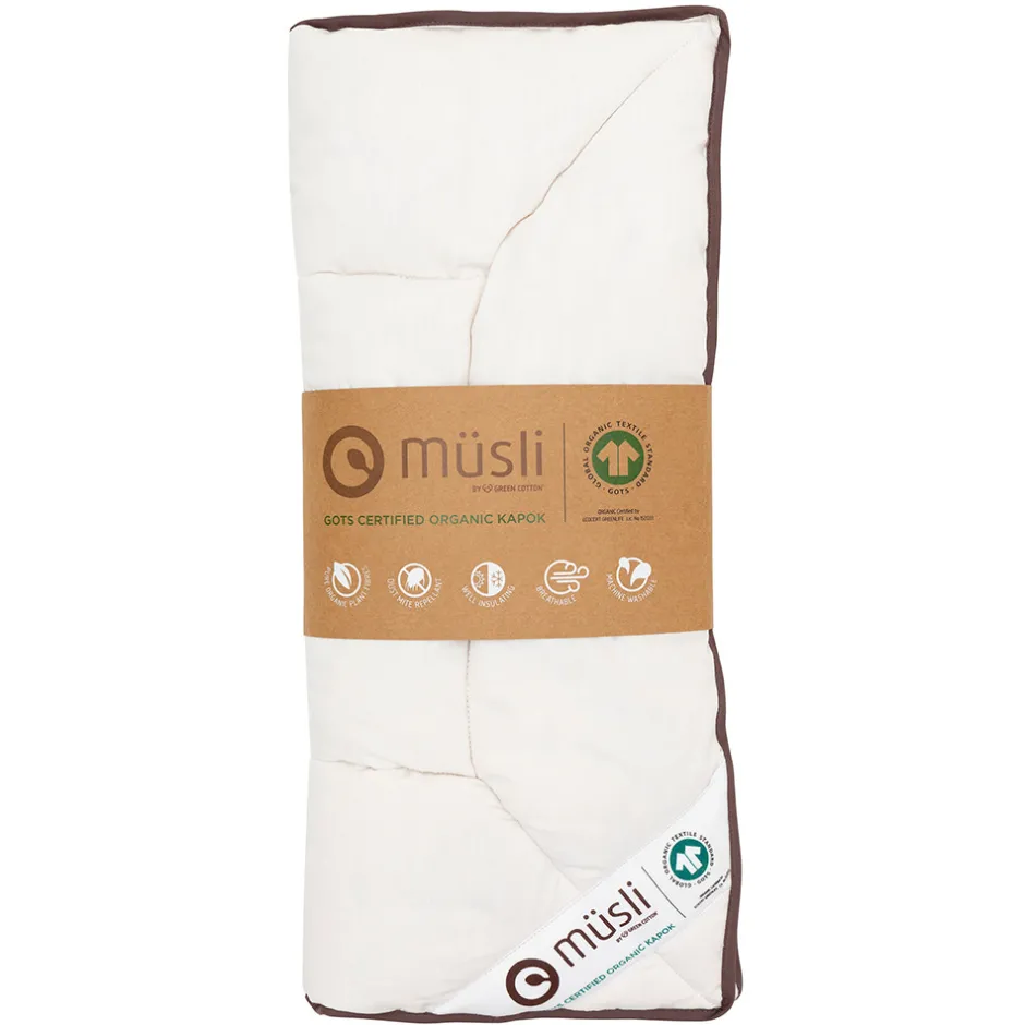 Müsli kapokpuden er lavet af rene plantefibre og er perfekte for folk med allergier. Puden er GOTS certificeret, betrækket er 100% økologisk GOTS certificeret bomuld og fyldet er 100% økologisk kapok. Kapok udvindes fra frøene fra kapoktræet, og er en hul fiber som består af 80% luft. Luften som er fanget i fiberen giver kapokken en fremragende isoleringsevne, og gør den til en af de letteste plantefibre i verden. Kapok er dejlig luftig om sommeren og holder på varmen om vinteren. Derudover er hver kapok fiber betrukket med naturlig voks som afviser fugt, hvilket forebygger mug og gør dem perfekt til folk med støvmideallergi.