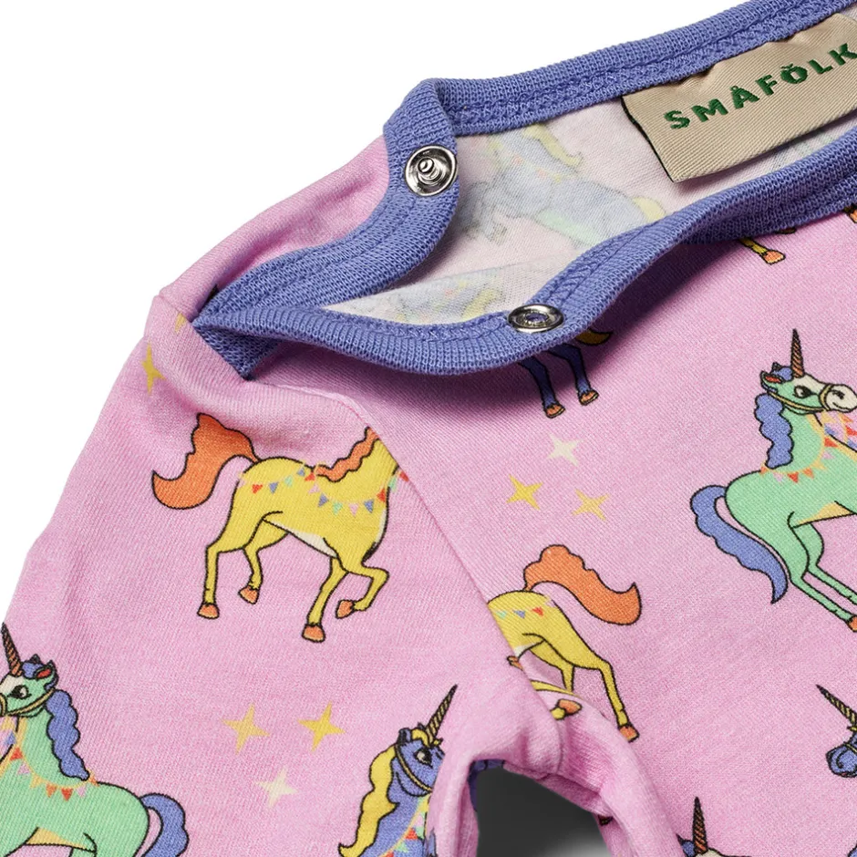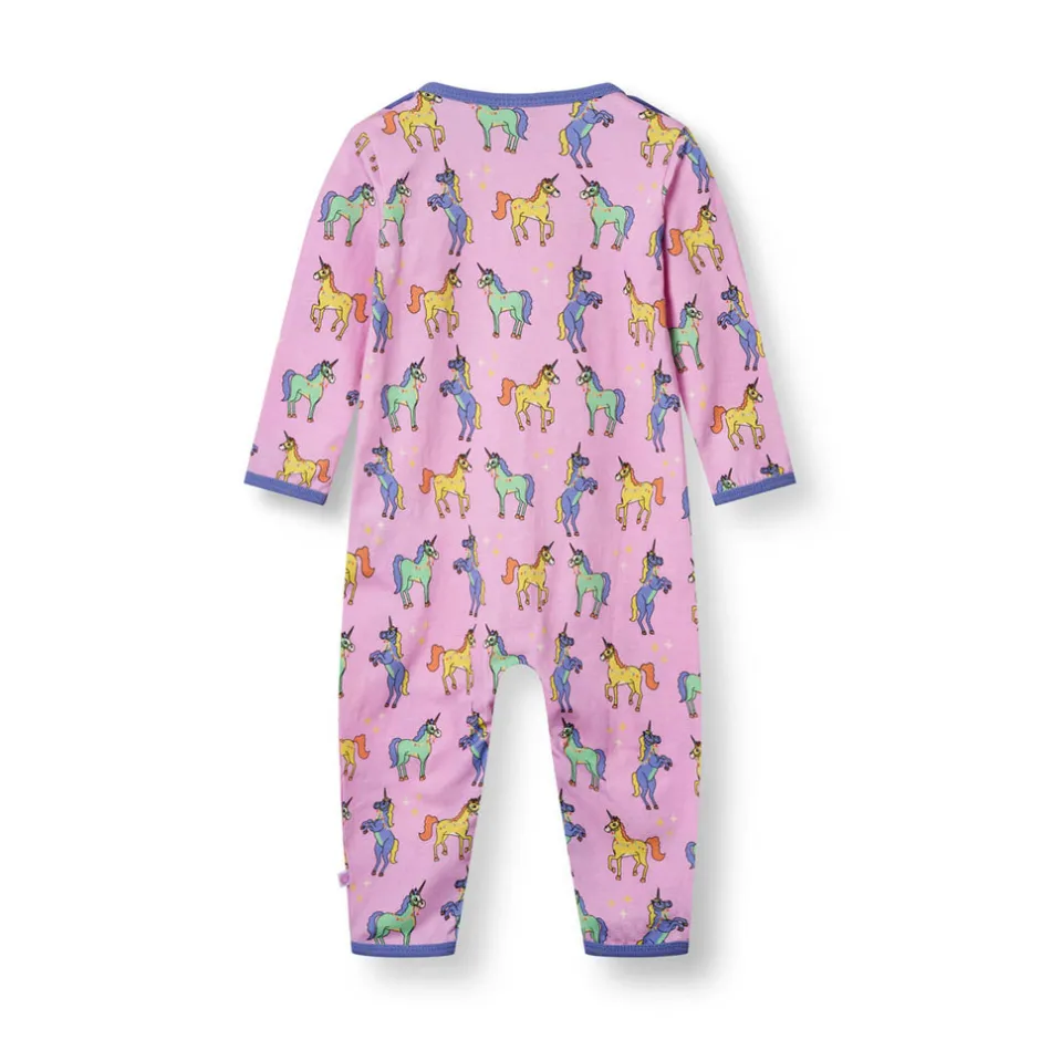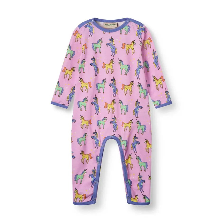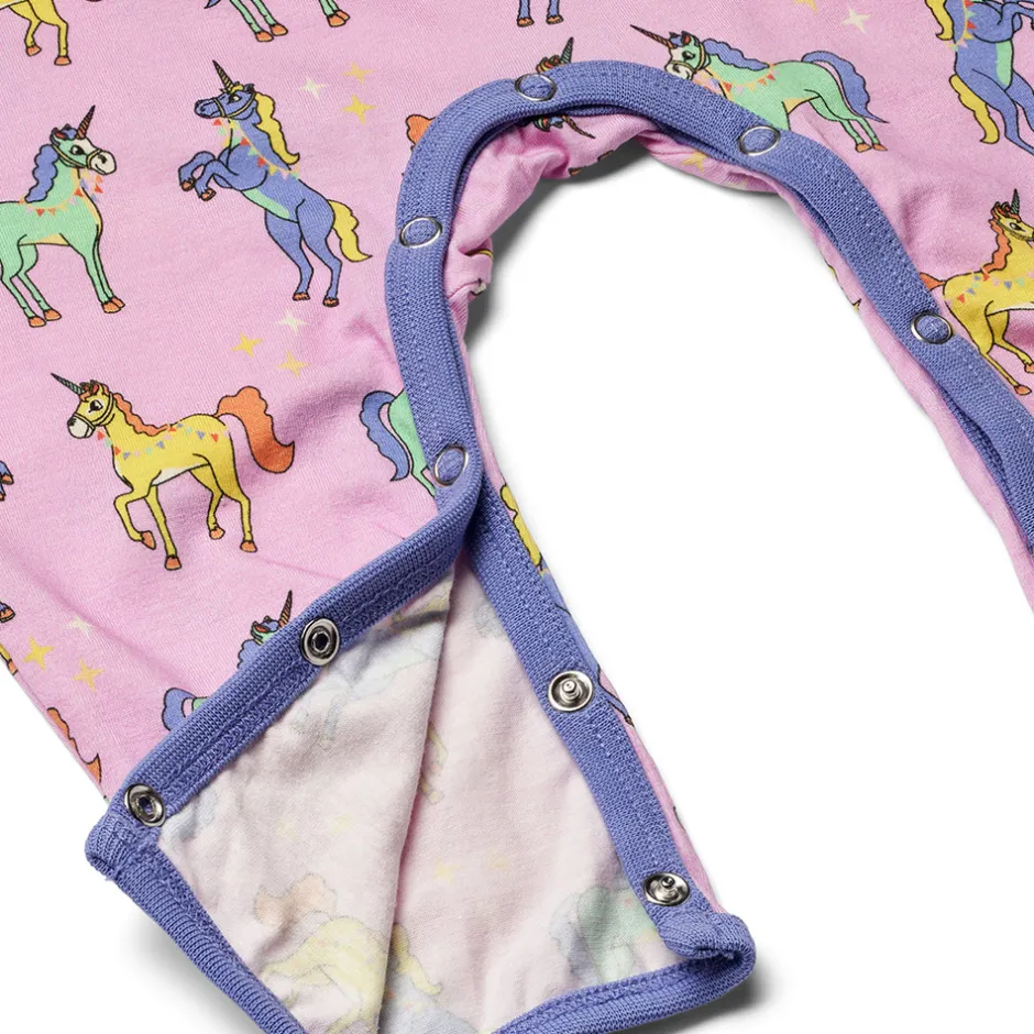 Heldragt til baby med enhjørninger, produceret i en økologisk og strækbar bomuldsjersey. Heldragten har en normal pasform med kuvertlukning og trykknapper, samt ribkant i hals og ærmer.