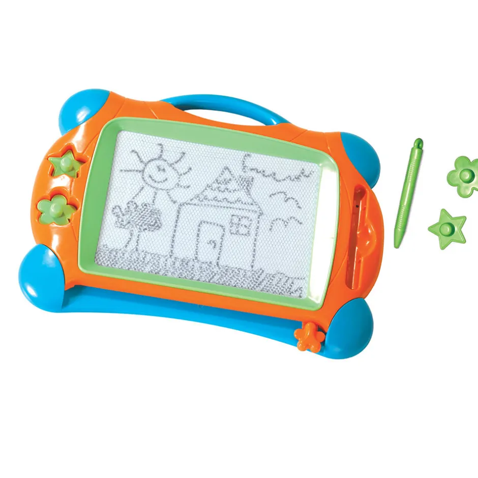 Vil du tegne helt uden oprydning og rod med tucsher og farveblyanter? Prøv det flotte magnetiske tegnebræt. Tegn smukke billeder, og gør dem ekstra fine med stempler. Så snart du er færdig, kan du trække knoppen hen over brættet og slette. Så er du klar til at starte forfra. Et perfekt værktøj til rejser, da du ikke behøver at medbringe ekstra papir eller tuscher. Tegn, helt uden rod igen og igen. Perfekt til rejsen for både de små og store børn.