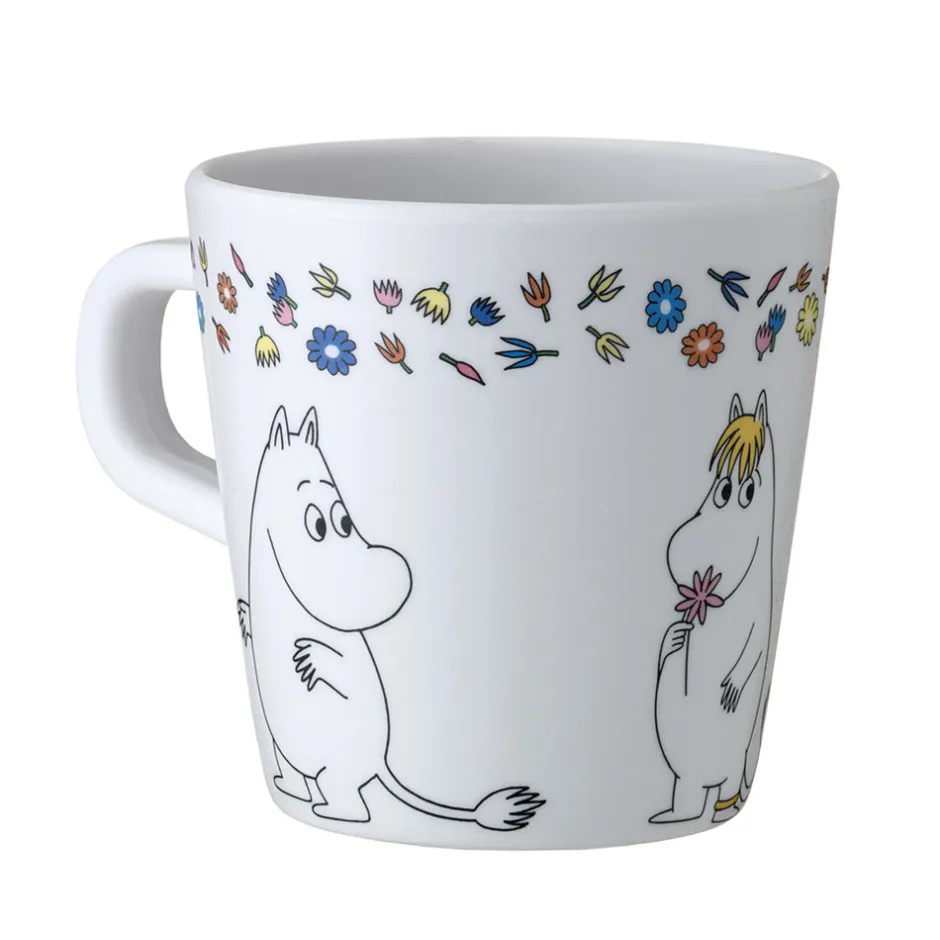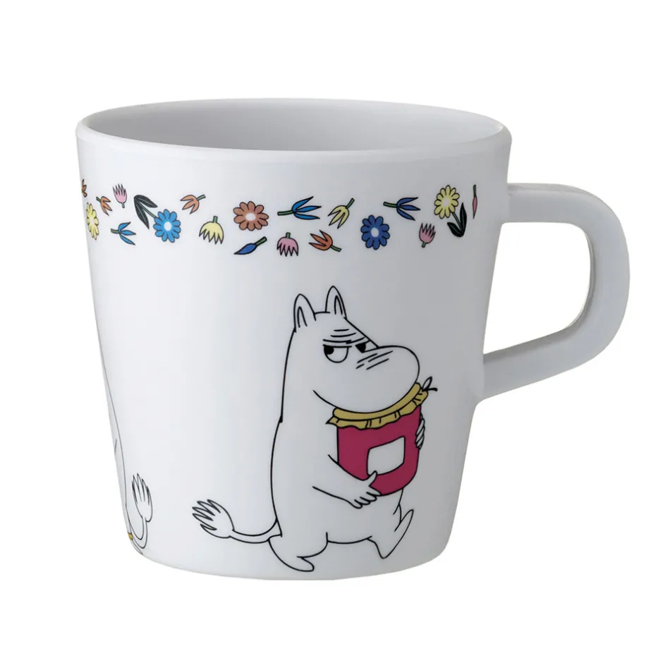 Et flot krus med hank med motiver fra Mumi søde verden. Et praktisk krus, når barnet selv vil holde på koppen og drikke.