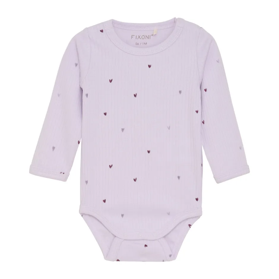 Body fra FIXONI med sødt all-over-print og blød ribstruktur. Bodyen er designet med praktiske trykknapper ved skulderen og mellem benene, som gør den nem at tage af og på. Den bløde ribkvalitet føles behagelig og skånsom mod barnets hud – perfekt til hverdagsbrug.
