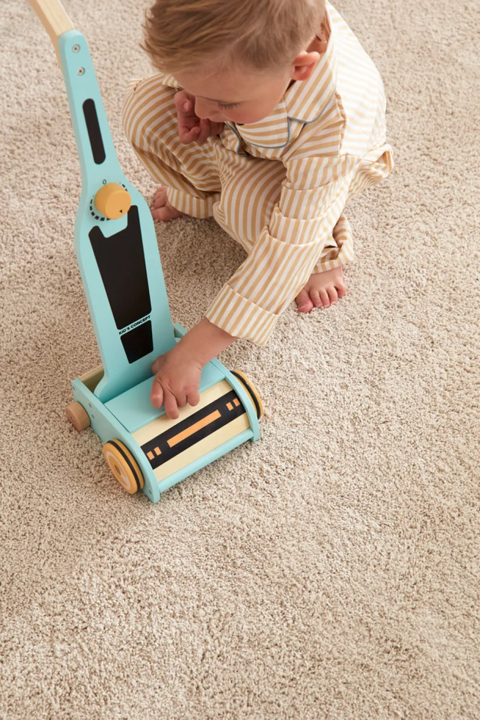 En træstøvsuger til børn. Nu kan dit barn hjælpe med at gøre rent. Læg de runde magnetpoletter ”snavs” på gulvet. Rul støvsugeren hen over dem og se dem forsvinde ved at de sætter sig fast i bunden af støvsugeren. Dette aktivitetslegetøj stimulerer børns fantasi og motiverer dem til, at lære at hjælpe til med hverdagens gøremål.
