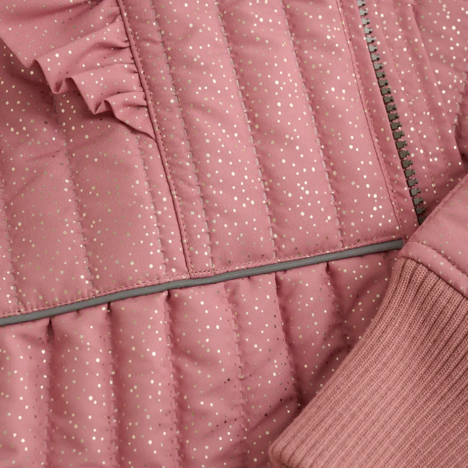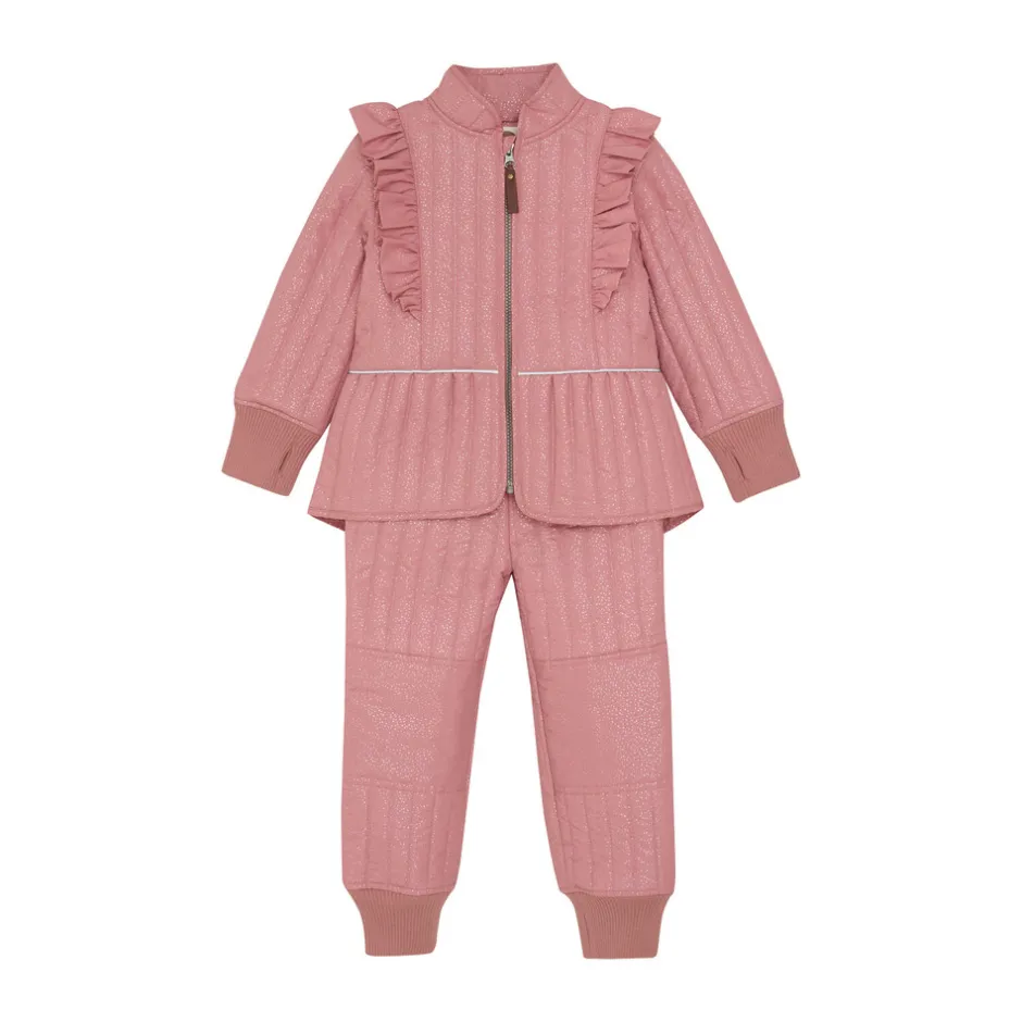 Termo sæt fra EN FANT med flot glitter design. Sættet består af en termojakke og termobukser i samme farve. Termojakken åbnes med kvalitetslynlås foran. Jakken har flæse på skuldrene og ned langs ærmernes på skæring foran og bagpå. Jakken har brede ribkanter i ærmerne med et praktisk hul til tommelfingeren. Jakken har lommer i siderne og refleksdetaljer bagpå. Jakken er lidt længere bagpå end foran. Termobukserne har elastikkant i taljen, som kan strammes sammen med en elastiksnøre på indersiden. Ved anklerne er der brede ribkanter.