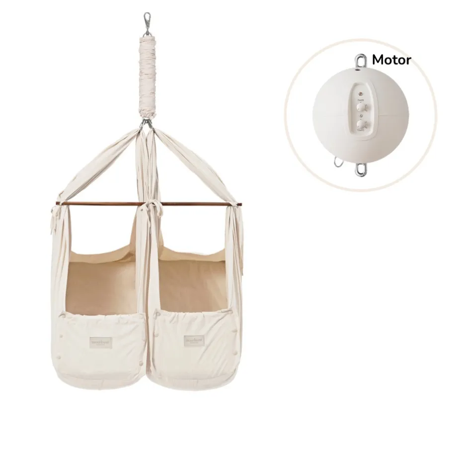 Vuggen: Tvillingeslyngevuggen efterligner de lette, vuggende bevægelser, som børnene kender fra mors mave, og er designet således, at der ikke behøves modvægt, når kun det ene barn ligger i den. Mange tvillinger finder tryghed i hinanden og har stor gavn af at sove sammen, hvilket gør, at de sover bedre. Dog sover mange asynkront, hvilket kan være opslidende for forældrene. Med Moonboons Tvillingeslyngevugge kan børnene ligge i slyngevuggen samtidig eller hver for sig alt efter deres søvnrytmer og behov. Den GOTS-certificerede økologiske Tvillingeslyngevugge er et funktionelt søvnprodukt, der skaber mere og bedre søvn for børnene.