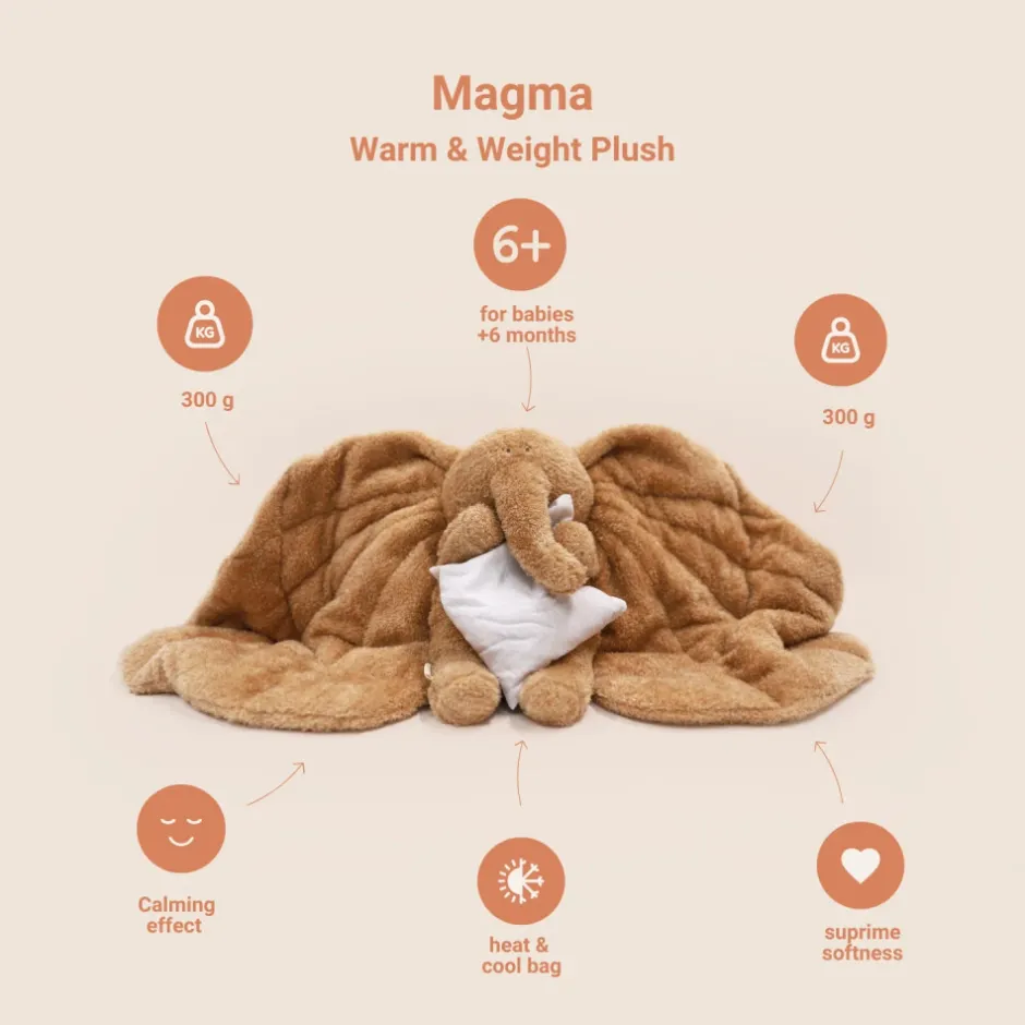 Magma er Dansk design og lavet af økologisk bomuld og polyester, som gør den blød og behagelig imod barnets hud. Den indeholder tyngde elementer, som har en beroligende effekt og hørfrø pude, som kan opvarmes og dermed give komfort og have en afslappet virkning.