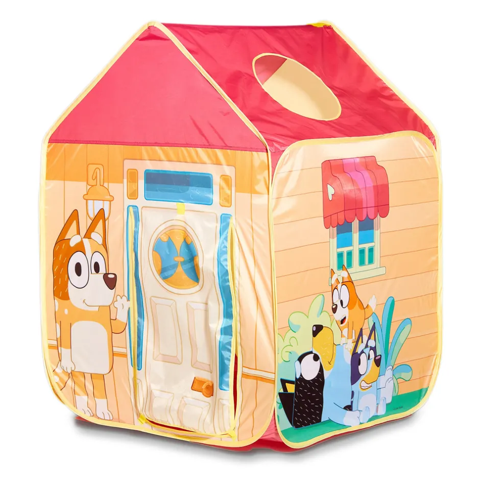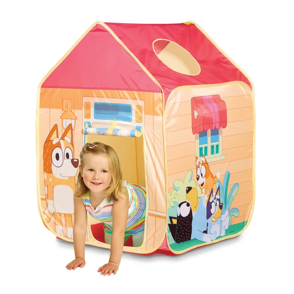 Pop-up legeteltet med Bluey og Bingo giver mange timers fantasifuld og sjov leg og det kan bruges både inde og ude. Skal far Bandit være med i legen? Teltet er nemt at stille op og pakke ned igen – Teltet har en bund, en indgangsdør og kikkehul i taget. Bluey er en elskelig, seksårig Blue Heeler-hund, der elsker at forvandle hverdagens familieliv til endeløse, legende eventyr. Tag den sjove og fantasifulde leg med dig hjem og genskab nogle af de mest mindeværdige øjeblikke fra Bluey-showet! Eller skab nogle af dine egne Bluey historier og eventyr.