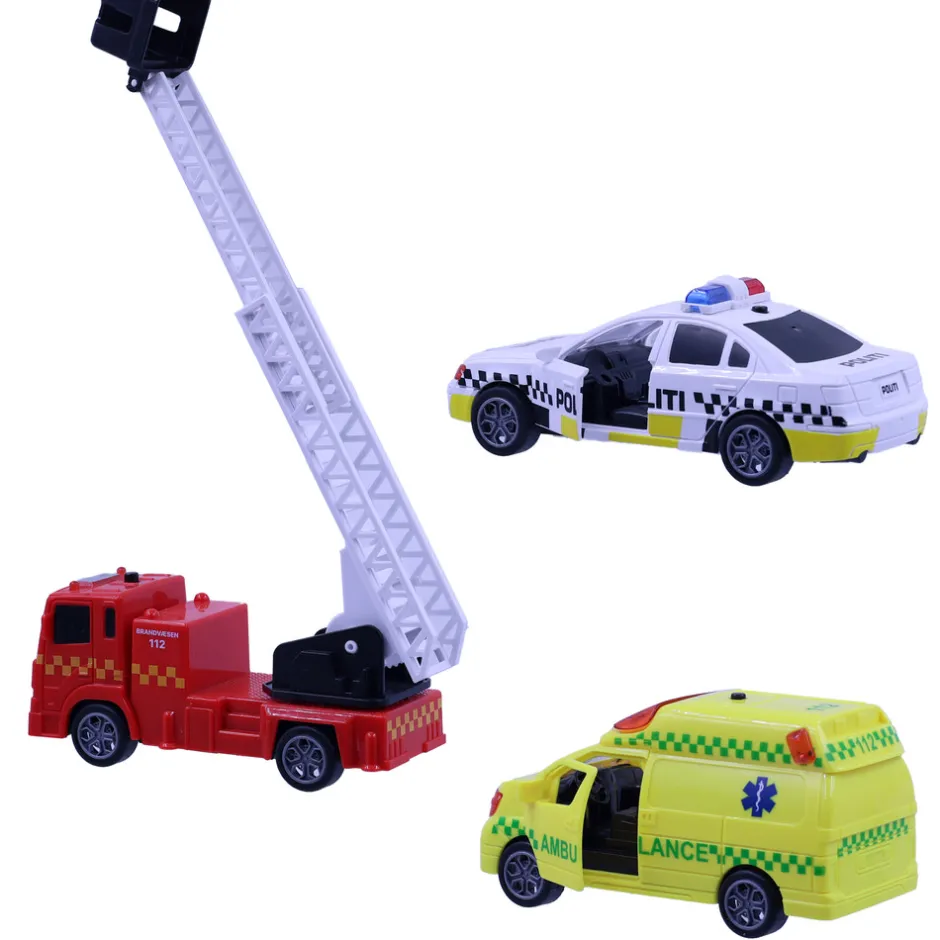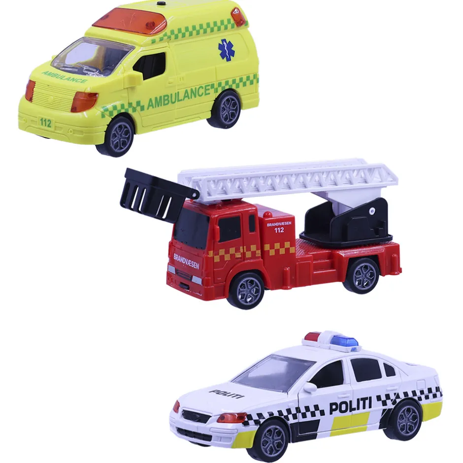 Denne 3-pak byder på mange timers leg og underholdning, og er den perfekte gave til de små poder som elsker udrykningskøretøjer. Pakken indeholder en ambulance, en brandbil og en politibil, der alle er udstyret med lys og lyd samt bevægelige dele. Derudover er køretøjerne også udstyret med pullback-funktion.